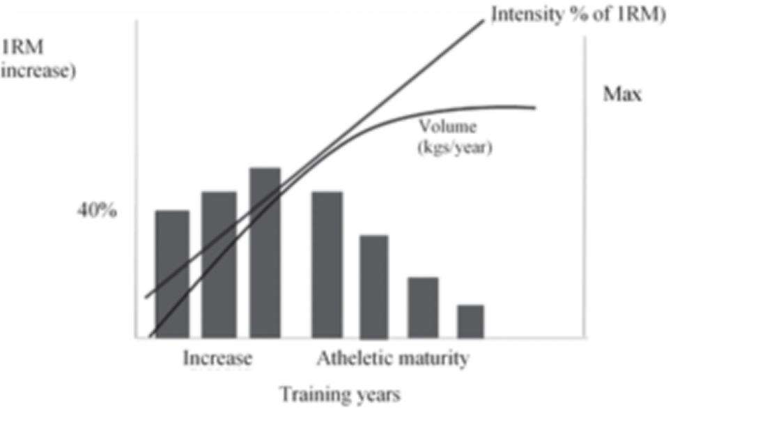 图3 随着运动生涯的发展,提高1RM所需的强度和容量(来源:作者理论)