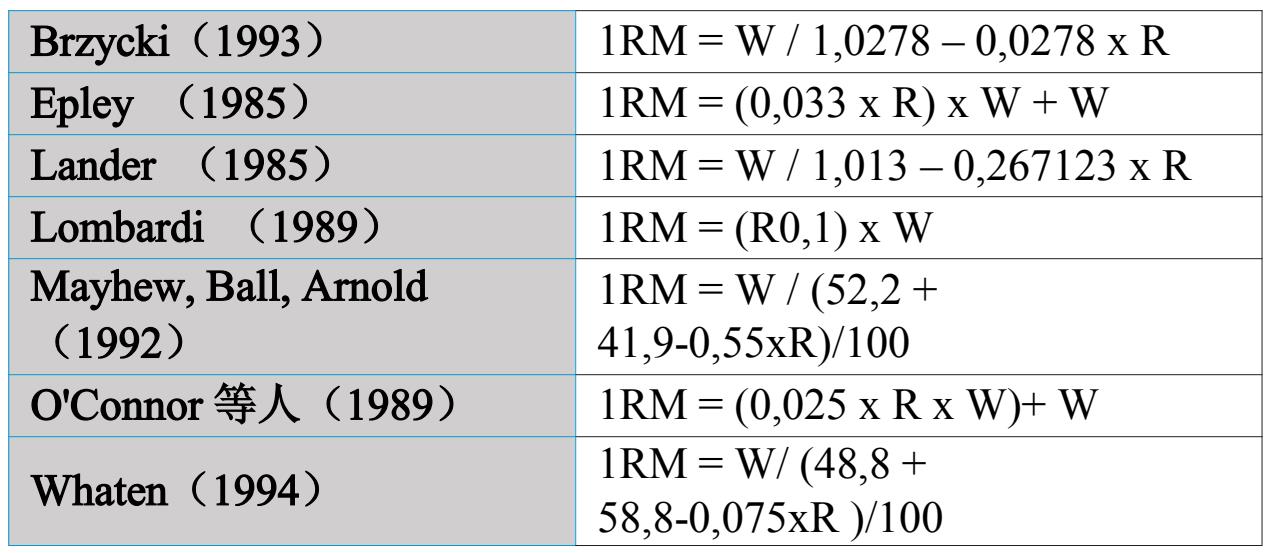 的50%负荷进行,一组用其75%的负荷进行,最后一组用其100%的负荷进行。1RM的概念被引入,1RM是通过不断递进的试举——增加负重、减少重复次数,直到无法成功完成动作得出的数据。由于需要从使用起始重量开始慢慢地达到目标重量,这种方法具有明显的缺点。为了克服这一缺点,在知道所用负荷和可重复次数的前提下(W=负荷;R=重复次数),学者们运用线性回归制定了各种不同的公式来估算1RM。