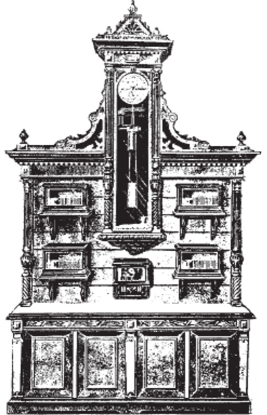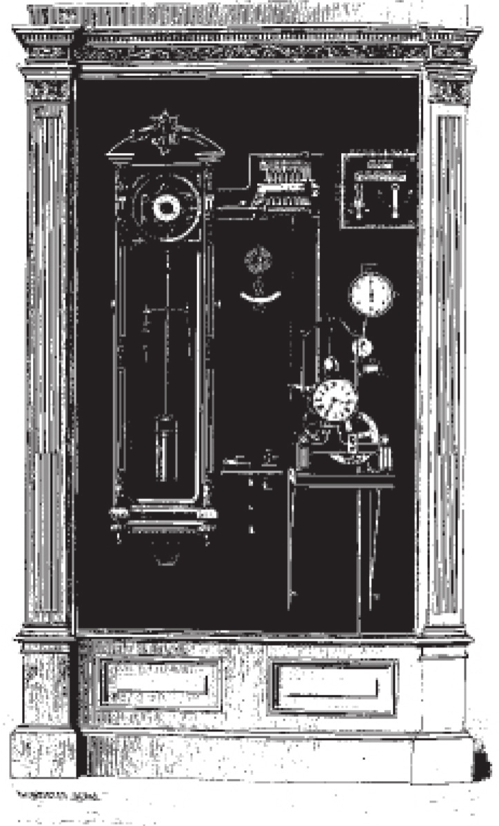 就像我们历史上的很多技术一样,时钟同步的起源尚不清楚。一个技术系统包含很多组成部分,到底哪一个部分才算作这个系统的决定性特征:是电的使用,还是很多时钟的分支,或者是对远程时钟的连续控制?无论人们如何猜想,19世纪30年代和40年代,英国的查尔斯·惠特斯通(Charles Wheatstone)、亚历山大·贝恩(Alexander Bain)和紧随其后的瑞士的马提亚斯·希普(Matthäus Hipp)以及其他欧美国家的无数发明家,开始建造配电系统来将彼此距离遥远的时钟连接到一个中心时钟,只是中心时钟有着不同的名称:母时钟(horloge-mère)、基准钟(Primäre Normaluhr)以及主时钟(master clock)。 [17] 在德国,莱比锡是第一座安装配电系统来实现时钟同步的城市,随后法兰克福在1859年安装了该系统。当时担任电报机厂负责人的希普在伯尔尼联合宫呼吁瑞士也要安装该系统,到1890年,有100个时钟一起开始运行。日内瓦、巴塞尔、纳沙泰尔和苏黎世等城市的铁路部门也紧随其后,每个地方都有了自己的时钟同步系统。 [18] 纳沙泰尔主时钟如图1-4所示,柏林主时钟如图1-5所示。