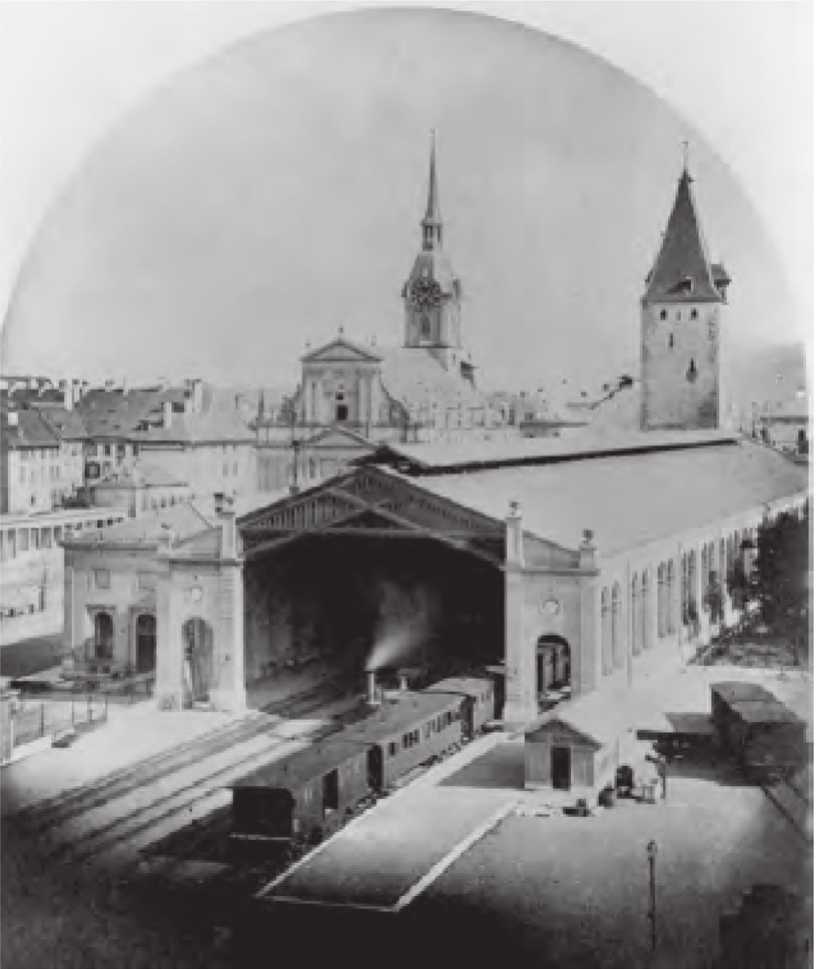 不久前,我站在欧洲北部的一座火车站,心不在焉地盯着站台上那些精美的时钟,它们排成行,但当时我根本没有想到相对论的问题。这些时钟显示的时间相同,可以精确到分钟。我很好奇,因为这些时钟太精美了。然后,我发现,我所看到的这些时钟,秒针也是同步的。我当时想,这些时钟不仅仅是运转良好,而且经过了校准调时。爱因斯坦在1905年发表的相对论论文中写道,要想理解远程同时性的意义,也必须进行时钟同步。事实上,古老的伯尔尼火车站(见图1-3)与伯尔尼专利局的办公室仅一街相隔,在伯尔尼火车站内,沿着铁轨的外墙上挂满了同步的时钟,非常壮观。