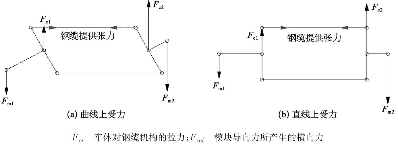 (2)曲线通过和迫导向机构的关系。迫导向机械机构和空气弹簧构成了悬浮架的悬挂系统,由空气弹簧垂向刚度传递垂向载荷,迫导向机构和空簧的横向刚度传递横向载荷。当车体在曲线上受到未平衡离心力和侧风影响时,钢管平行四边形机构的形态和受力情况如图2-29所示。