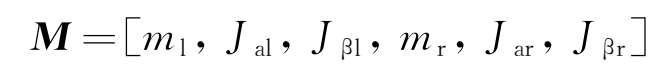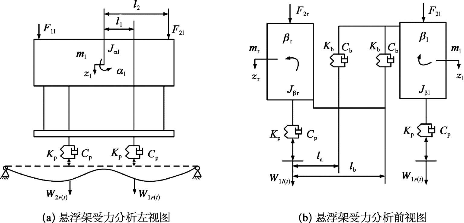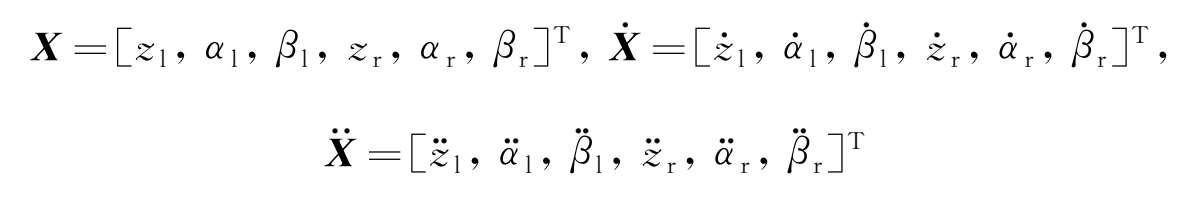 z 1 , z r , α l , α r , β l , β r ——悬浮架单元的左右两边的垂向位移、点头角度和侧滚角度。