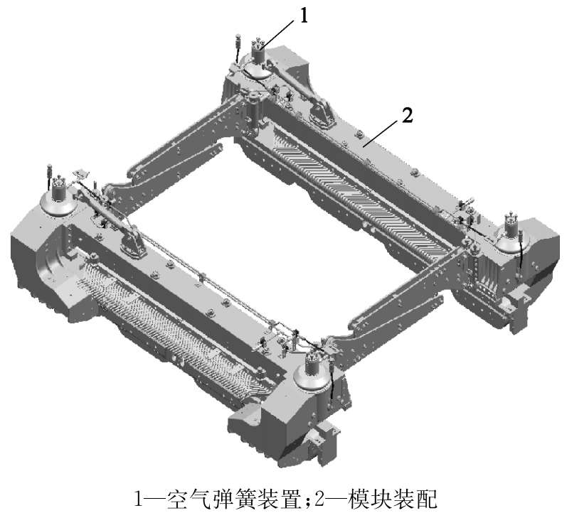 根据结构要求,模块1~5各安装上空气弹簧,同侧相邻两个空气弹簧及端部第1、第10两个空气弹簧上安装滑块平台,滑块平台与车体底架下平面之间横向可相互滑动,纵向不能相互移动。第1个空气弹簧上的滑块平台的滑动量为210mm。第2、第3个空气弹簧上的滑块平台的滑动量很小(如果刚性连接在车体上,滑块平台成为车厢的转动中心,横向几乎不会滑动)。第4、第5个空气弹簧上的滑块平台的滑动量为105mm。