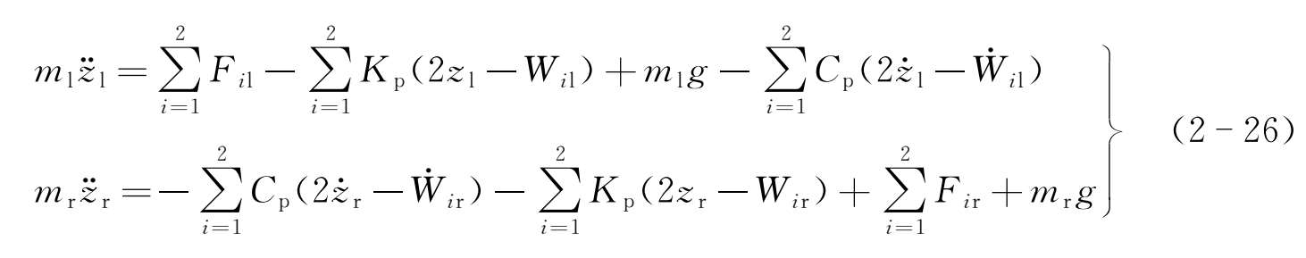基于悬浮架单元垂向动力学特征,通常考虑沉浮、侧滚和点头三个运动,而忽略横移运动和摇头运动。悬浮架单元结构如图2-30所示,在轨道上的动力学模型如图2-31所示。悬浮架单元主结构为左右以及前后对称结构,基于此,通过右半部分以及前半部分的受力分析就可以获知整个悬浮架的受力情况。悬浮架左、右模块为刚体,模块之间通过前、后两组弹簧阻尼单元连接,可用 K b 、 C b 表示,这里刚度和阻尼可能来源于弹性件以及结构件两个方面。每个刚体都有三个自由度,分别为沉浮、侧滚和点头。 F 1l 、 F 2l 、 F 1r 和 F 2r 分别为车体通过四个空气弹簧传给悬浮架的作用力。