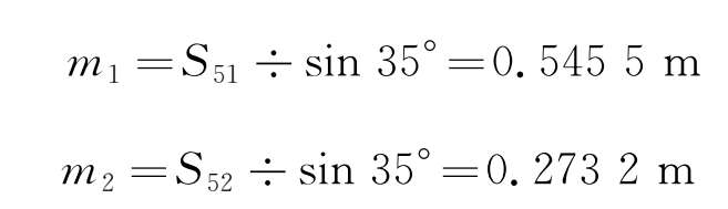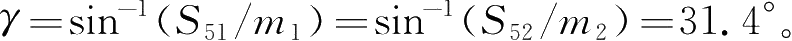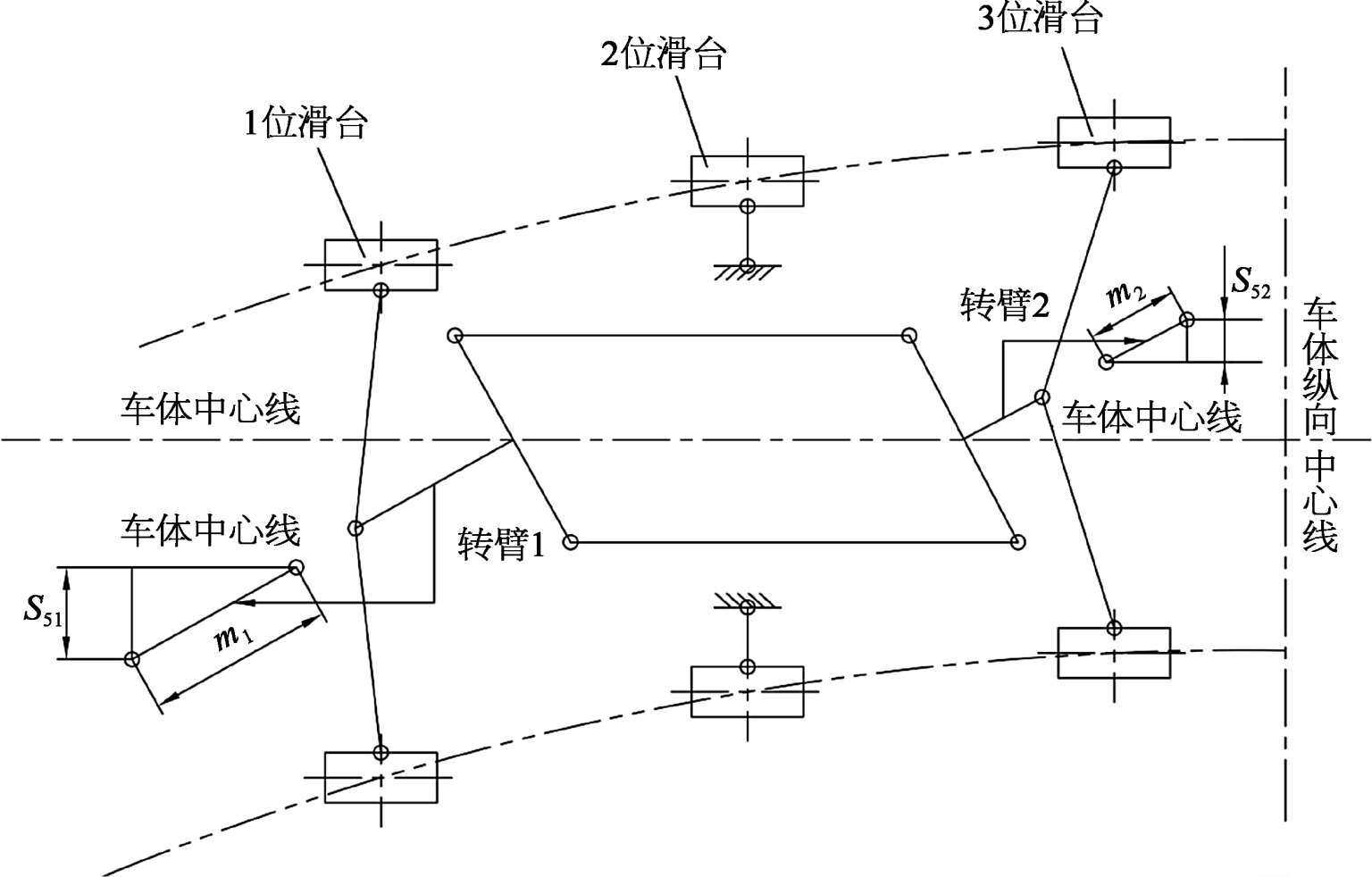 图2-28中, S 51 为模块1滑台与车体的横向距离, S 51 =312.9mm; S 52 为模块2、3共用滑台与车体的横向距离, S 52 =156.7mm; γ 为转臂转过的角度; m 1 、 m 2 为转臂长。