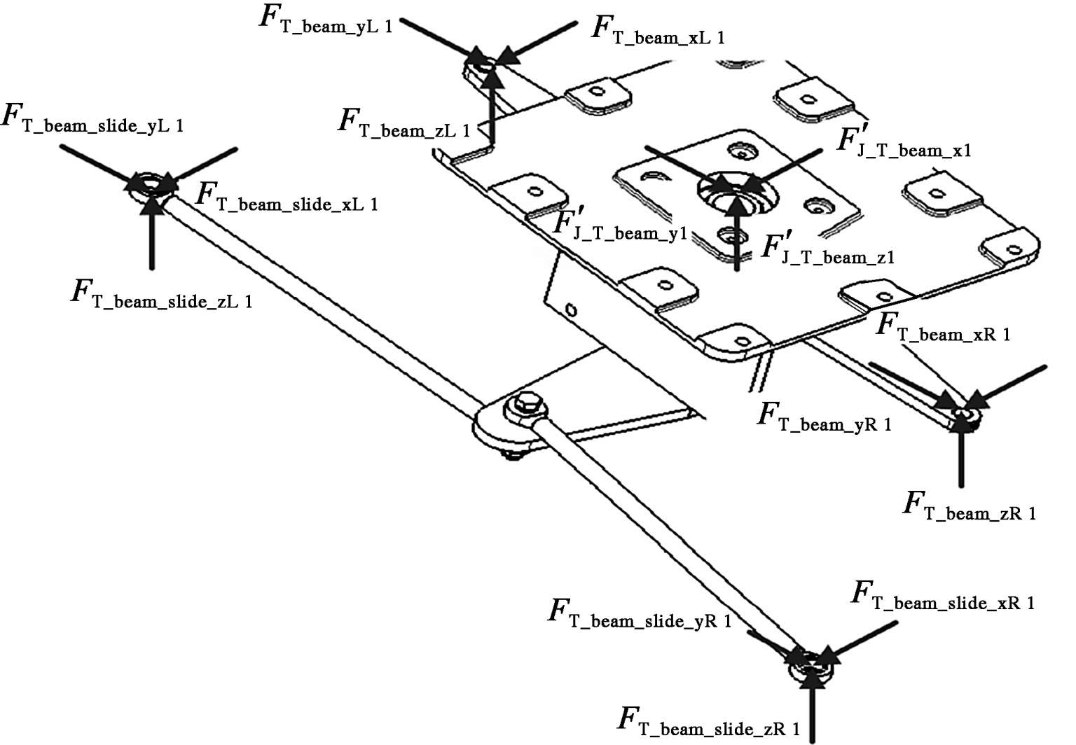 位长T形臂与纵向长拉杆之间的x/y/z方向作用力;