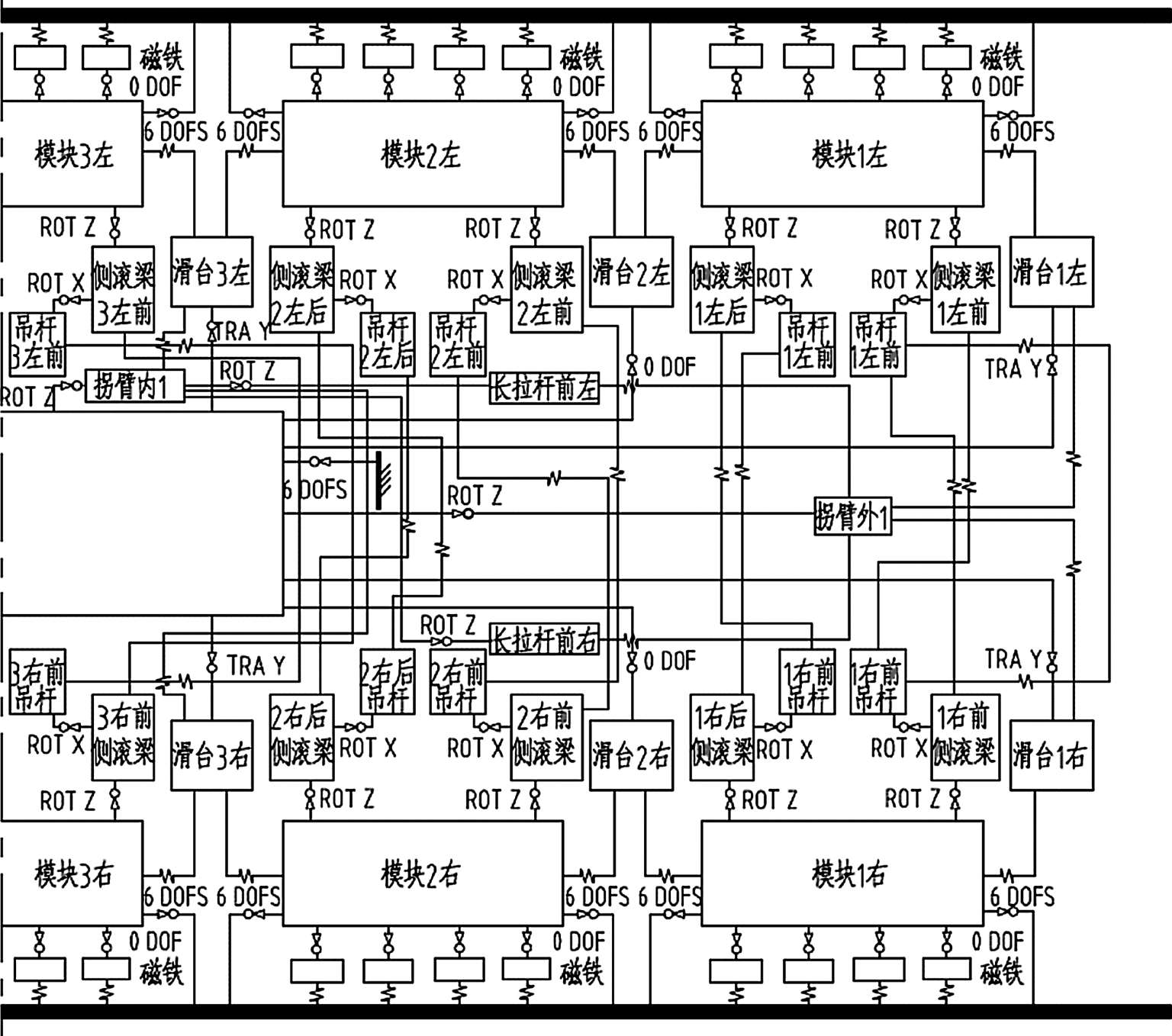 在受车体结构约束的情况下,对于悬浮架单元而言,每个单元都必须适应各种线路要求,在直线、过渡曲线、圆曲线的运动过程中,左右模块之间需要满足三个方向的自由度:前后错位适应内外轨不同弧长变化;左右拉开适应轨距要求;模块点头运动适应线路扭转。这部分功能主要通过悬浮模块实现。模块结构如图2-22所示。