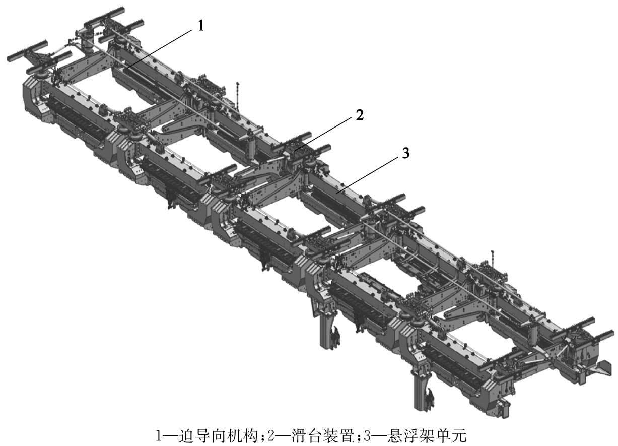 磁浮车辆车体由5组悬浮架单元共同支撑,其结构包括模块装配、电机悬挂装置、牵引装置、支撑轮装置、垂向滑橇装置、空气弹簧装置、空气管路、液压管路(图2-21)。根据不同的悬浮架单元位置,选择性布置基础制动装置、测速定位装置。
