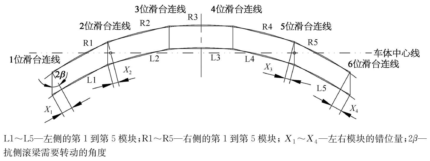 左右模块通过曲线时的几何形态如图2-23所示。由于直线导轨副的作用,左右滑台和车体纵向位置不能改变,而且始终要和车体中心线保持垂直,图2-23中标出了6位滑台的连线。滑台和模块靠纵向拉杆连接,所以模块和滑台纵向移动量很小。因此,图中L1/R1、L2/R2、L4/R4和L5/R5都要发生错位,从原先的矩形结构错位成平行四边形结构,计算得出: