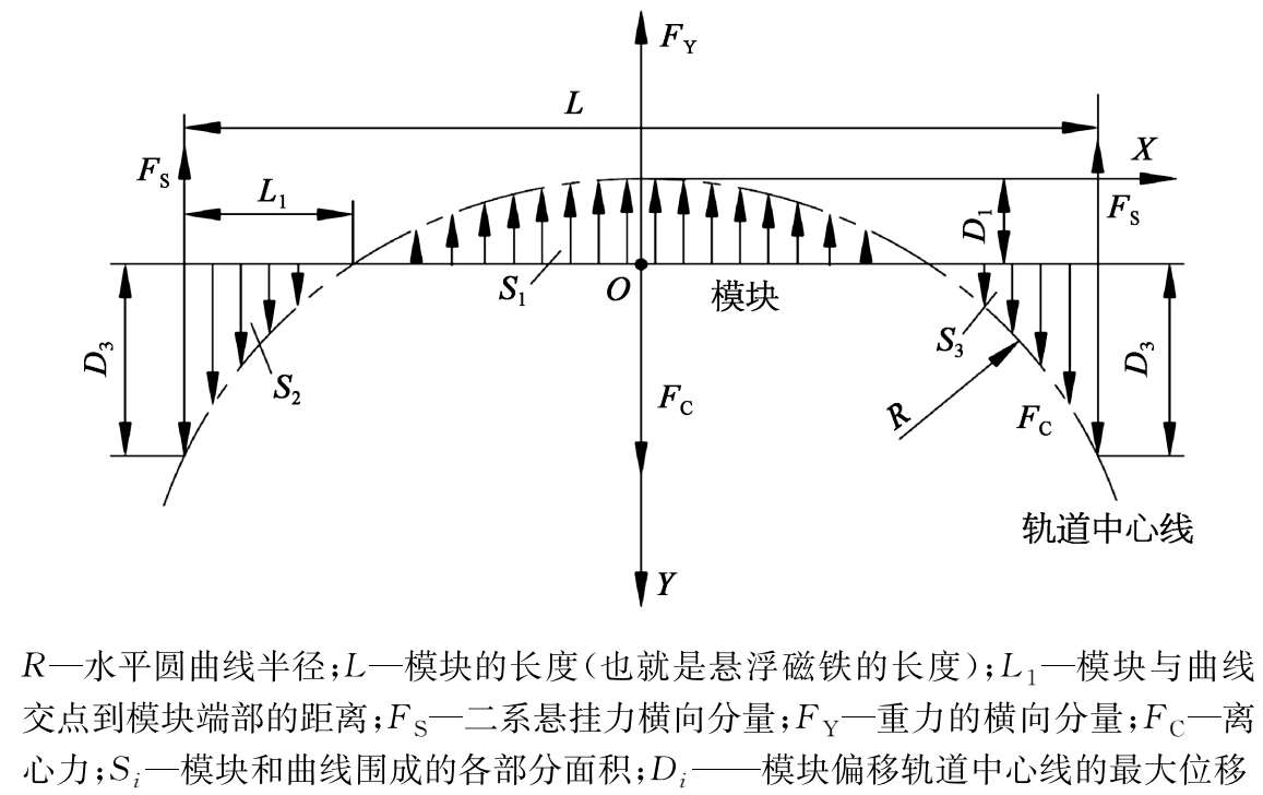 以上分析考虑的只是模块的几何曲线通过,实际中模块还要受到悬挂力、离心力和重力横向分量。当模块正好以一定的速度平衡通过曲线时,模块正好在这样的位置达到受力平衡。如果模块通过曲线的速度增大(或减小)或者受悬挂力的影响,模块就向外轨(或向内轨)横移,相对调整导向磁力的增大(或减小),从而达到受力平衡。可以说,曲线通过时平衡位置一直在 D 2 = D 3 =2 D 1 处左右。