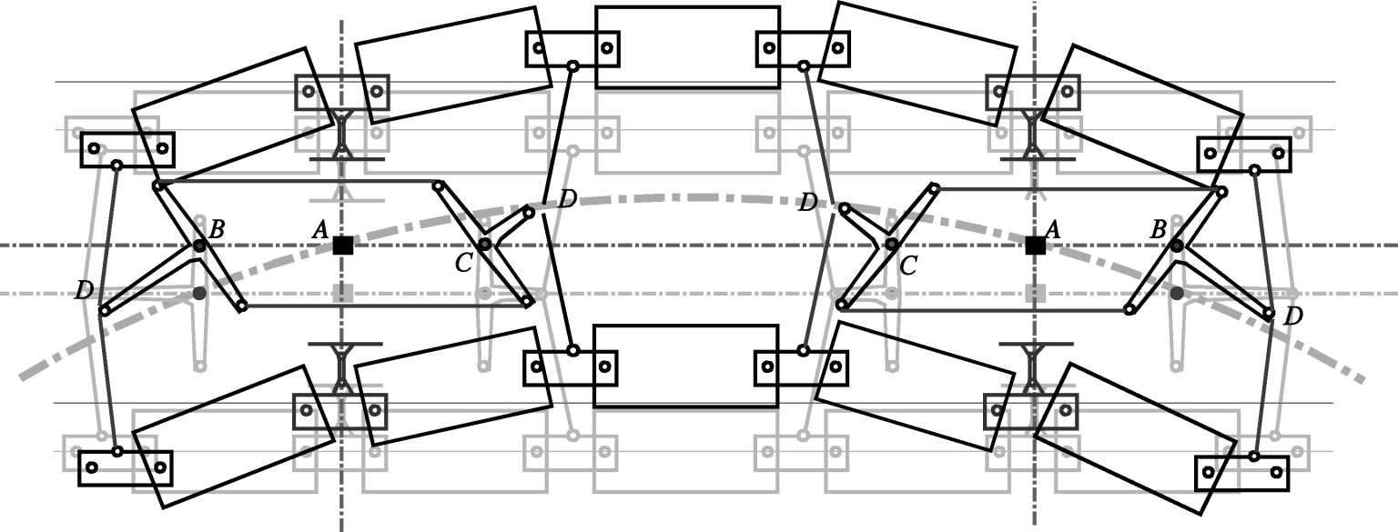 (2)迫导向机构转动销与车体的销接。整车装两套迫导向机构,与车体共有四处销接。在曲线上某些左右滑块的中心点在被动导向力的作用下将占据接近线路中心线的位置(图2-25中的 D 点),该图中 A 点则相当于车体与下部悬浮架的固定转动点,由于连杆的定位, A 点将基本保持在线路中心线上,而车体销接点 B 、 C 将偏离左右模块中心线,通过机构作用强迫悬浮架导向。