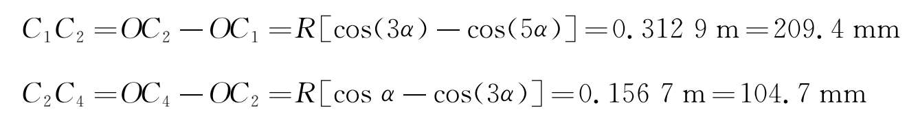 过R 75m曲线时,计算得出 X 1 = X 4 ≈141.4mm, X 2 = X 3 ≈70.7mm。
