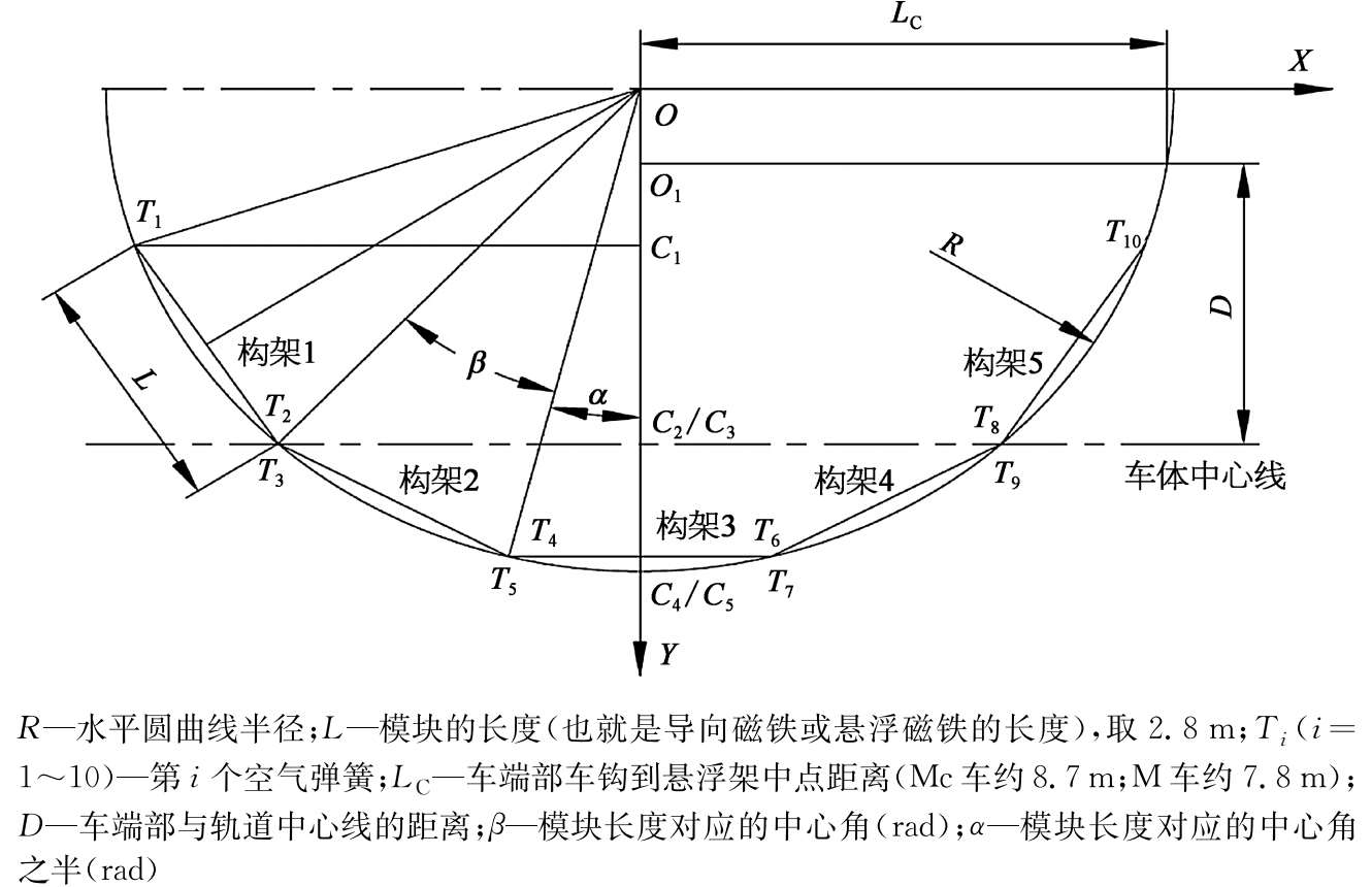 在车辆过曲线时,车体在滑台的滑槽上横向滑动,不同位置的横向位移不相等。车辆通过越小的曲线,车体相对于悬浮模块的横向位移就越大。而且当单个悬浮模块和曲线内接时,车体的横向位移也最大。模块相对于曲线如果是其他形态,车体相对横移量会略小一些。所以几何曲线通过分析时,假设单个悬浮模块和曲线内接。模块水平圆曲线通过分析如图2-27所示。