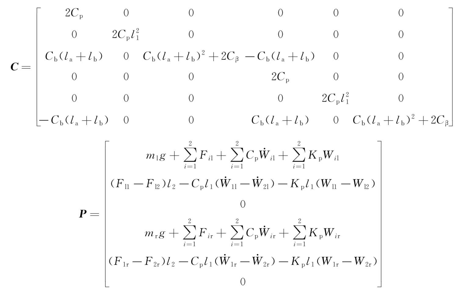选取 M 、 C 、 K 和 P 分别表示质量矩阵、阻尼矩阵、刚度矩阵和广义载荷矩阵,由式(2-26)~式(2-28)可知其具有如下形式: