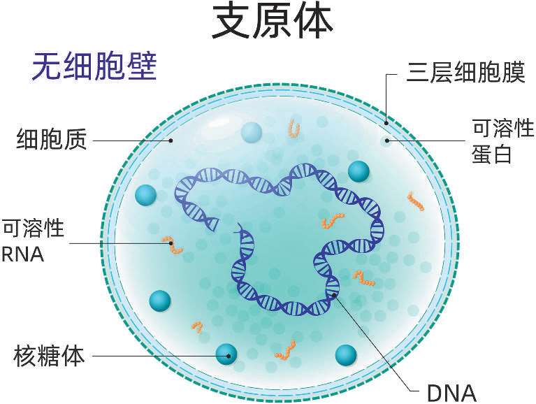 支原体(mycoplasma)是一类没有细胞壁的原核生物,是目前发现的最小的原核生物。与人类疾病关系密切的支原体是肺炎支原体,结构简单,多数呈球形,没有细胞壁,只有三层结构的细胞膜,细胞柔软,具多形性。