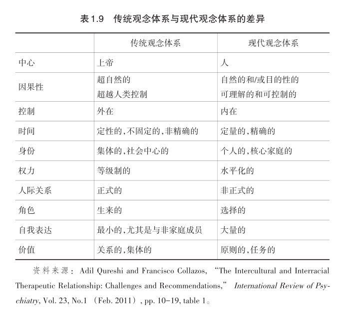 再次,就观念系统而言,这些非西方传统大国由于历史、宗教、文化的原因存在着相当大的差别,但它们总体上又共享着某种前现代的观念体系。现代化理论学者过去常常将不同社会区分为传统社会与现代社会。这两种社会之间的观念差异,也被视为传统观念体系与现代观念体系的不同。有学者将传统观念体系与现代观念体系的差异总结为10个主要方面,包括中心、因果性、控制、时间、身份、权力、人际关系、角色、自我表达、价值观等,参见表1.9。由此可见,传统观念体系与现代观念体系之间存在巨大的鸿沟。如果18世纪的英国和西方更接近于右侧的现代价值观,那么同时期的非西方传统大国则更接近于左侧的传统价值观。