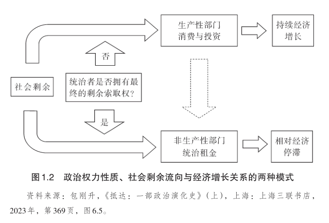 关于政治权力性质、社会剩余流向与经济增长关系的两种不同模式,参见图1.2。由于缺少立宪主义的政治框架,统治者在这些传统帝国中实际上始终控制着社会剩余的最终索取权。结果就是,社会剩余源源不断地从生产性部门流入非生产性部门,转化为统治租金,而无法为持续的经济增长提供新增投资与资源,从而导致陷入长期的经济停滞局面。这是许多非西方传统帝国陷入“马尔萨斯陷阱”而无法实现经济水平向上突破的基本逻辑。实际上,在跟西方发生剧烈碰撞之前,奥斯曼帝国的经济与技术早已陷入了停滞,俄罗斯等其他传统帝国的情形也大同小异。