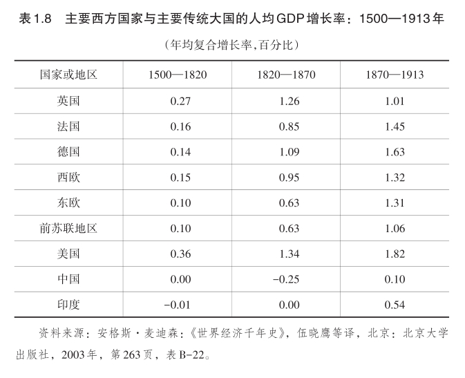 实际上,政治权力以各种不同的方式实现对社会剩余的支配,是许多非西方传统大国的基本特征。由此,这些大国在经济系统上的另一个特点是普遍陷于长期的相对停滞状态。这种相对停滞即便不是总量意义上的,至少也是人均水平意义上的。到18世纪,这些非西方传统大国在经济上止步不前已经有许多个世纪了。这里借用麦迪森关于不同国家经济增长率的历史数据来进行比较,参见表1.8。该表尽管没有包括本书关注的每一个主要传统大国,但至少包括了俄罗斯(用前苏联时数据替代)、印度、中国这三个传统大国的长期经济增长率数据。该表显示,1500—1820年这320年间,大体是英国工业革命之前的两个半世纪,俄罗斯的人均GDP年均增长率仅为0.1%,中国和印度在此期间则基本是零增长,印度甚至还发生了轻微的衰退。同一时期,英国的人均GDP年均增长率达到了0.27%——这一数据以今天的标准来看还很低,但至少是俄罗斯增速的2.7倍。1820—1870年这半个世纪中,英国的人均GDP年均增长率达到了1.26%,而同一时期的俄罗斯、中国、印度则分别仅为0.63%、-0.25%和0.00%。该表没有专门提及或单列的奥斯曼帝国(土耳其)、伊朗和埃及,其人均GDP年均增长率大体可以参照俄罗斯、中国与印度的数据。