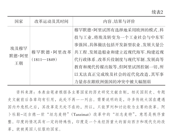 这项研究把改革视为一个国家在既有政治权威与领导层主导下的变革或近代化运动。然而,表1.10显示,对非西方传统大国来说,既有政治权威与领导者主导下的改革运动即便可以产生相当的成效,但最终来说往往无法使其真正克服已然摆在面前的政治危机。不仅如此,在这一过程中,这些国家的危机还在不断地加重——尽管每个国家实际上存在着较大的差异。所有这一切,最终都指向一个根本性的目标,那就是非西方传统大国必须实现全面的现代化。否则,它们既无法解决自身发展的需要,又无法在一个已然全球化的国际竞争体系中实现政治生存。在与英国和西方世界发生碰撞之后,非西方传统大国的唯一选择,不是在既有政治模式下的修修补补,而是彻底的改弦更张,奋起直追,以一种新的方式来努力推进工业革命和全面的现代化。