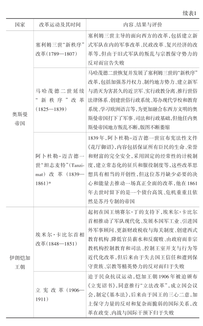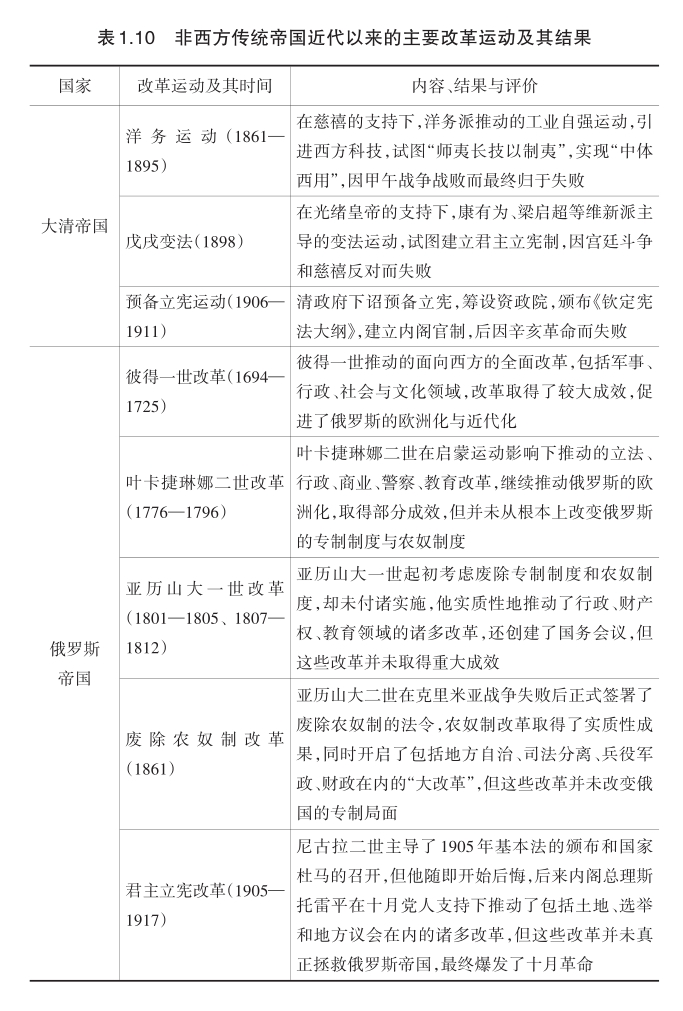 其中较为典型的事件,就是许多传统大国都进行过面向西方与现代化的改革运动,参见表1.10。各传统大国的改革运动有着不同的侧重点,在技术、制度与文化三个层次或者在政治、经济与观念三个领域有着不同的组合,在传统与现代或者自身与西方之间也有着不同的比例选择。一般来说,这些改革运动既可能产生较为显著的绩效——特别是当主要统治者与精英阶层有相当的改革共识之时,又可能收效甚微——这往往跟主要统治者在改革问题上的三心两意或精英阶层关于改革缺乏共识有关。但真正的问题在于,这些改革能否让这些非西方传统大国摆脱内外政治危机,进而走向国家的重生呢?表1.10显示,这些改革运动尽管在绩效与成果上表现出较大的差异,但就结果来说,往往没有让这些传统大国走出严重的政治危机,亦无法走向真正的国家重生。