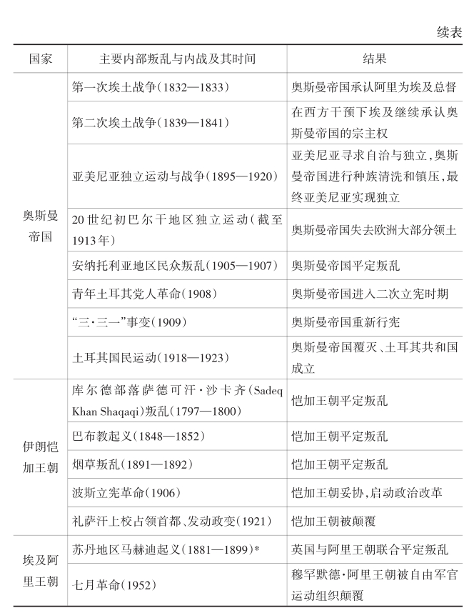 该表显示的关键信息是:第一,主要的非西方传统大国1800—1900年间普遍地经历了许多内部叛乱、内战与政变。第二,由于不同的历史与地理条件,不同传统大国在内政上面临的政治压力与危机的类型是不同的,比如,大清帝国主要是大规模的农民起义和边疆少数族裔的反叛,俄罗斯帝国主要是小规模的农民暴动和边疆地区的民族独立运动,奥斯曼帝国主要是高层近卫军兵变、边疆地区的民族独立运动和地方势力的反叛,伊朗主要是不同政治势力对于高层权力的争夺、地方势力的叛乱和底层因内外原因而爆发的起义,埃及主要是内部权贵势力的竞争和边疆地区的民族独立运动,印度主要是帝国权威垮塌之后地方势力的兴起与四分五裂的竞争格局。第三,结合上述讨论,这些传统大国其实面临着国际政治危机与国内政治危机互相交织和联动的局面。一方面,国际政治危机容易加重这些传统大国国内政治秩序的压力;另一方面,国内政治危机又设定了这些传统大国在处理国际政治危机时的内部约束条件。