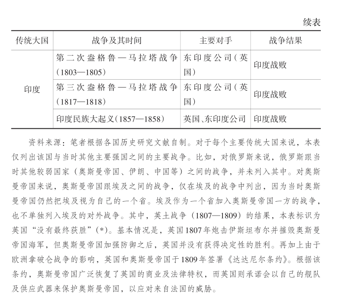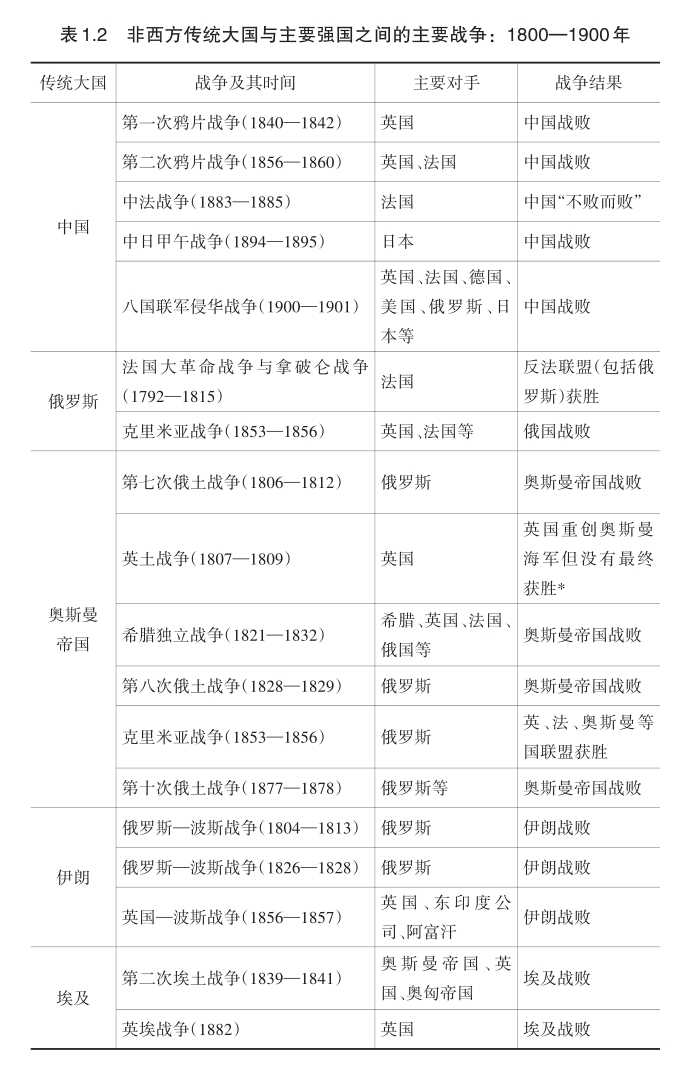 表1.2提供了许多关键信息:第一,非西方传统大国在1800—1900年间普遍面临跟英国、西方国家或其他主要强国之间的多次战争。由此也可以推断,对这些非西方传统大国来说,这种战争的压力是持续的。第二,非西方传统大国通常较难赢得跟英国、西方国家或其他主要强国的战争,亦即它们的对外战争常常面临挫败。俄罗斯赢得跟法国之间的战争,是因为加入了包括英国、普鲁士与奥匈帝国在内的反法同盟。这并非俄罗斯单独赢得的战争,而是欧洲反法同盟赢得的战争。第三,基于上述信息,有充分理由推断,至少在国际层面或军事竞争层面,这些非西方传统大国到19世纪已经处于显著的下风,甚至时刻都会面临战争失败的风险与危机。