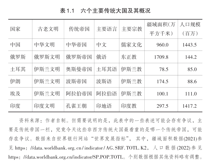 本书关注的“大国”或“传统大国”是指传承了某种主要的古老文明传统并且在今天仍然具有较大地理疆域和人口规模的国家。这些国家有几个主要特点:(1)这些国家不仅具有某种主要古老文明的传统,而且是该文明的主体性传承者;(2)由于历史的、宗教的、文字的、文化的、政治的原因,这些国家与其古老的文明传统之间并未发生完全的断裂,依然在相当程度上维持着对其古老文明的认知与认同;(3)这些国家今天仍然具有较大的地理疆域与人口规模,至少具有数十万平方公里的领土和数千万规模的人口。这种较大的国家规模使其仍有机会成为一个区域性的重要国家。就这项研究的主题而言,这里主要考虑的是西欧及其衍生文明之外的传统大国,本书称其为“非西方传统大国”。