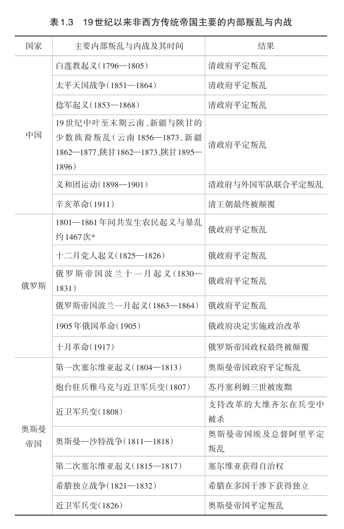 所有这些都会加剧非西方传统大国的国内政治危机。对传统大国来说,国内政治危机最为典型的表现,就是内部叛乱与内战。本书粗略统计了非西方传统大国1800—1900年之间经历的主要内部叛乱与内战,参见表1.3。