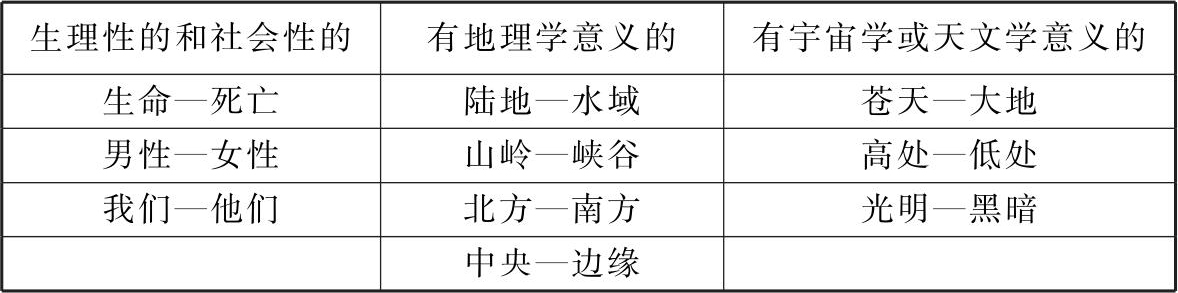 。在其他一些文化中,这两种颜色另有一些其他的情感含义,但其共同点是确切的,即人类的意识有一种倾向:将连续的自然界切分开来,从中挑选出一些事物结成对子,并把相反的含义赋予对子的每一方。这种倾向或许反映出人类意识的结构特征,但其中一些呈现两极分化的配对包含着强烈的情感力量,影响着人类在所有层次上的经验。人类有一些最重要的矛盾体验,例如生命和死亡、男性和女性、“我们”(或者“我”)和“他们”,从这些对子里我们就能揣摩出这种力量。而后这些生理性和社会性的体验又会体现在现实生活中。