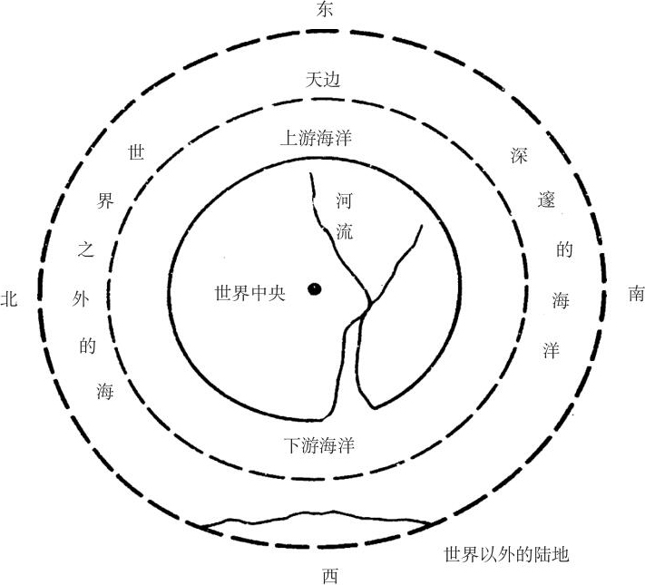 大地是扁平的,浮在一片更大的水面上,这种观念在世界各地都曾经出现。它可以牢固地存在于人们的脑海中,无论其所处的环境是什么样子,哪怕是荒原遍布、高山耸立或是海域蔓延。比如说,生活在加利福尼亚州北部的尤洛克(Yurok)族印第安人把自己的世界设想成一个圆饼,而事实上他们家乡的地表是崎岖不平的(图3)。尤洛克族人平时在克拉马斯河流域捕鱼、采集橡实。他们主要的食物(鲑鱼)的来源就是这条河,交通也依赖这条河。他们对山上的乡村总是心存芥蒂,尽管那里有很多小路四通八达,但是出行和贸易主要还是通过水路。尤洛克族人并不明确区分东南西北方向,他们标定方向的依据就是他们地理环境中最核心的要素——克拉马斯河,他们用上下游来指明方向。由于河流是蜿蜒不定的,所以上下游这种表达可能意味着各个方向;但由于河的走向非常清晰,于是它就以自己的方式把这些人的世界一分为二。由此看来,方向感并不一定会造就一个对称的世界。尤洛克族人所熟悉的世界很小,直径不过2500米而已。超出这个范围,他们对其他人的存在的感知就只能模模糊糊的了。尤洛克族人知道克拉马斯河注入大海,而他们也相信,循着河往上游走,长则十二天,短则十天,就又能看到咸水了。于是他们认为水包围着圆形的地面,克拉马斯河从中穿过。在河岸的某一点上,也就是三一神(Trinity)从南方降临之地的附近,就是所谓的qe’ nek,即世界的中心点。也就是在这一点上,天空被创造出来。天空是一个固态的穹顶,穹顶之上是天界,有一道天梯将人界与天界连接起来。地下是亡者之域,从一个湖底可以通达