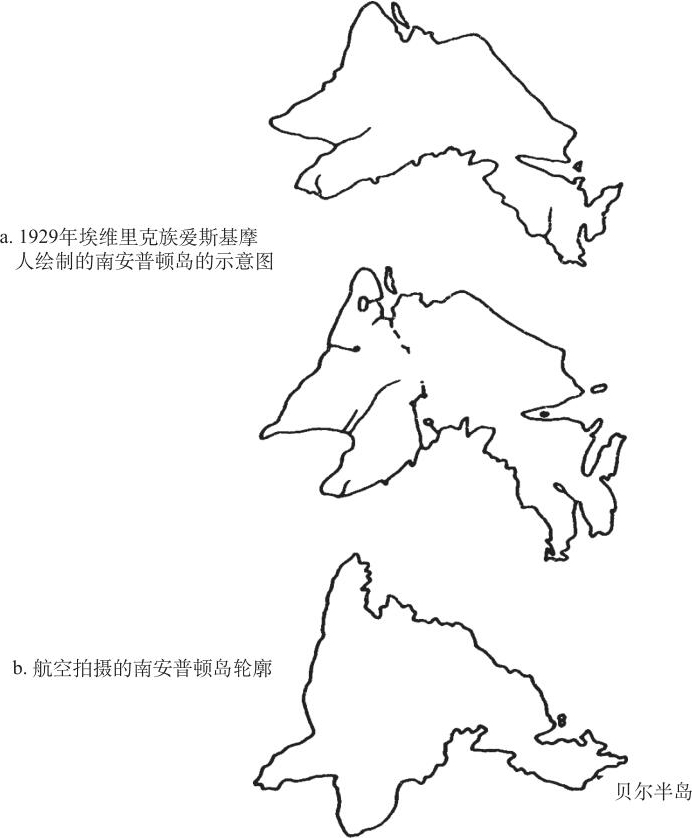 在航空照片真实地反映出南安普敦岛的形状以前,一些埃维里克族人曾经应邀画出家乡的形状。他们所画出的轮廓,包括海湾的细节,已经相当精准(图2)。一个显著的问题在于贝尔半岛相对于整个岛屿的比例被夸大了。对于大多数住在这个半岛上的人来说,这没什么可惊讶的。人们都会夸大自己家乡的范围,缩小邻居的领地。比如说,得克萨斯人对美国的印象很可能就是,一个巨大的得克萨斯州,被周边几个小州包围着,离这颗孤星