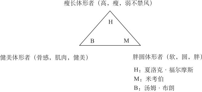 ,等等,而不去回味这些人物的外形,这几乎是不可能的事情。体格和性格似乎是浑然一体的,我们很难想象出一个瘦骨嶙峋的米考伯或者心宽体胖的福尔摩斯。在日常生活中,人们经常从他人的外表而非行为来推断其人格和禀赋,这是很正常的。不过,行为显然是很重要的;如果不去理解行为,科学家们可不敢轻易地做上面那样的联系,甚至不会那样去联想。在20世纪的三四十年代,威廉·谢尔顿(William Sheldon)做了一次大胆的尝试,要在体形和脾气秉性间建立起联系。他的工作广受批评,因为人们认为他的分类方法可谓幼稚,不过近来的研究还是支持了他的一部分结论