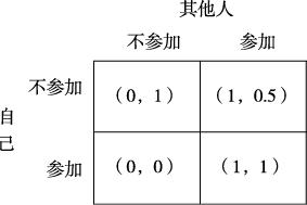 从图3-2来看,个人作出参加的决定通常是在知道和了解其他人也会有类似的选择的情况下做出的。如果他们不知道或者所掌握的信息与自己的决定相反,那么,个人选择参加的概率就趋近于零。此外,在这一选择过程中,个人的收益结构也在某种意义上受其他人行动选择的影响,所以,行动者之间的相互作用也就不断地影响着个人的选择。