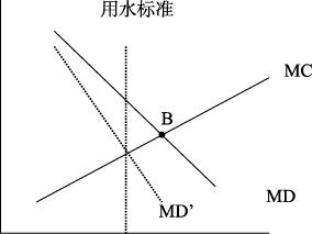 再者,水资源税的征收也是影响和改变社会行动的一个机制,从图3-3中我们可以理解,在没有对水资源使用征收额外税费之前,用水的边际成本(MC)与用水的边际需求(MD)之间的均衡点在B点;如果政府界定一个最低限度的用水标准,超过这一标准,就对超额用水行为征收高倍的水资源费或水资源税,这样,用水的边际需求曲线就可能会移至MD’,促使水资源的供求均衡点从B向前移动。因为,水资源税的征收,意味着用水的边际成本无形中得以提高,那么人们的用水的边际收益将随之而减少,从而会导致人们对水的需求量随之下降。