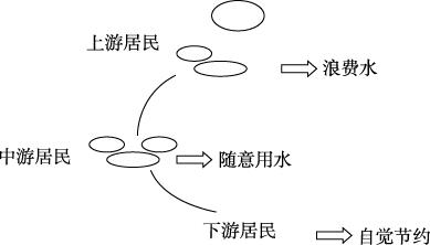 在图3-4中,我们可以看到,通常情况下处在河流上游,或者是河流的中游地段的居民,如果他们拥有较丰富的水源,并能够较容易获得这些水源,为自己创造价值,那么,他们就可能会尽量多地使用水,如果缺乏有效地控制,浪费水就成为自然,他们较少考虑到处于资源劣势地位的下游居民的缺水问题。
