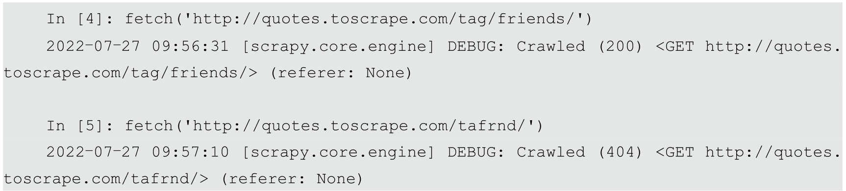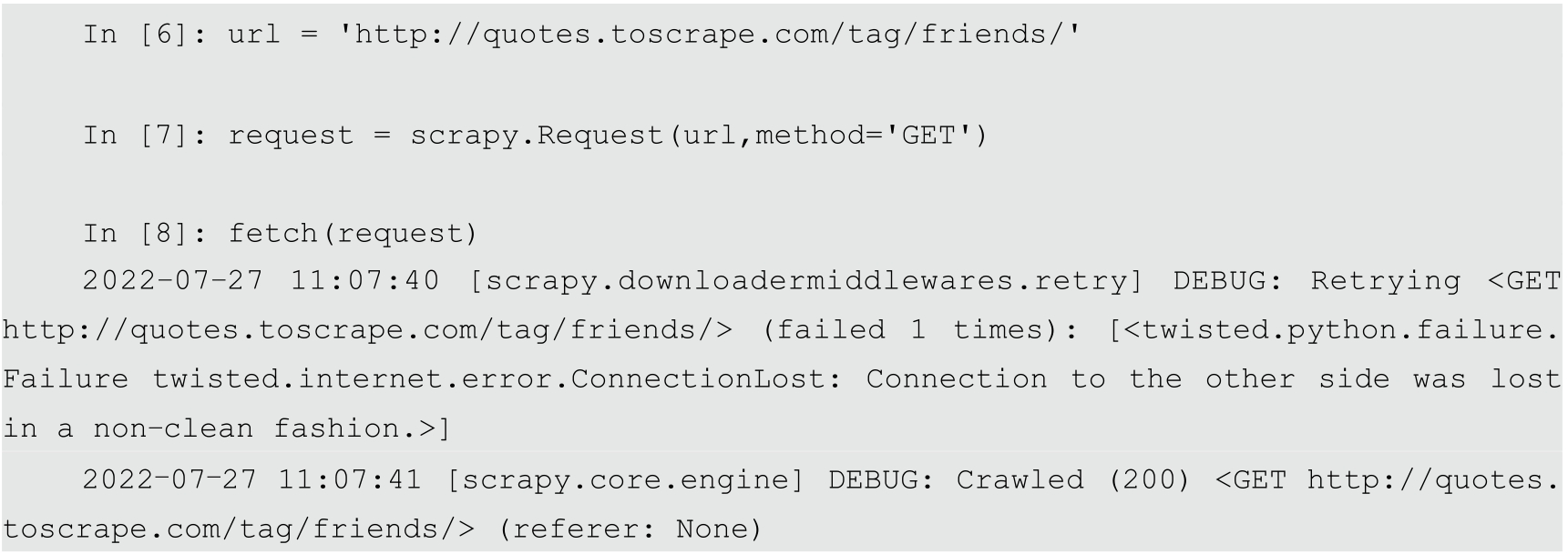 fetch(request):我们可以创建一个Request对象,并将其传递给fetch()方法,为此,需要创建一个Scrapy对象。Request类提及到了所需的HTTP方法、网页的URL、标头(如果有的话)。我们要抓取URL=‘http://quotes.toscrape.com/tag/friends/’的网页,我们需要准备请求对象为: