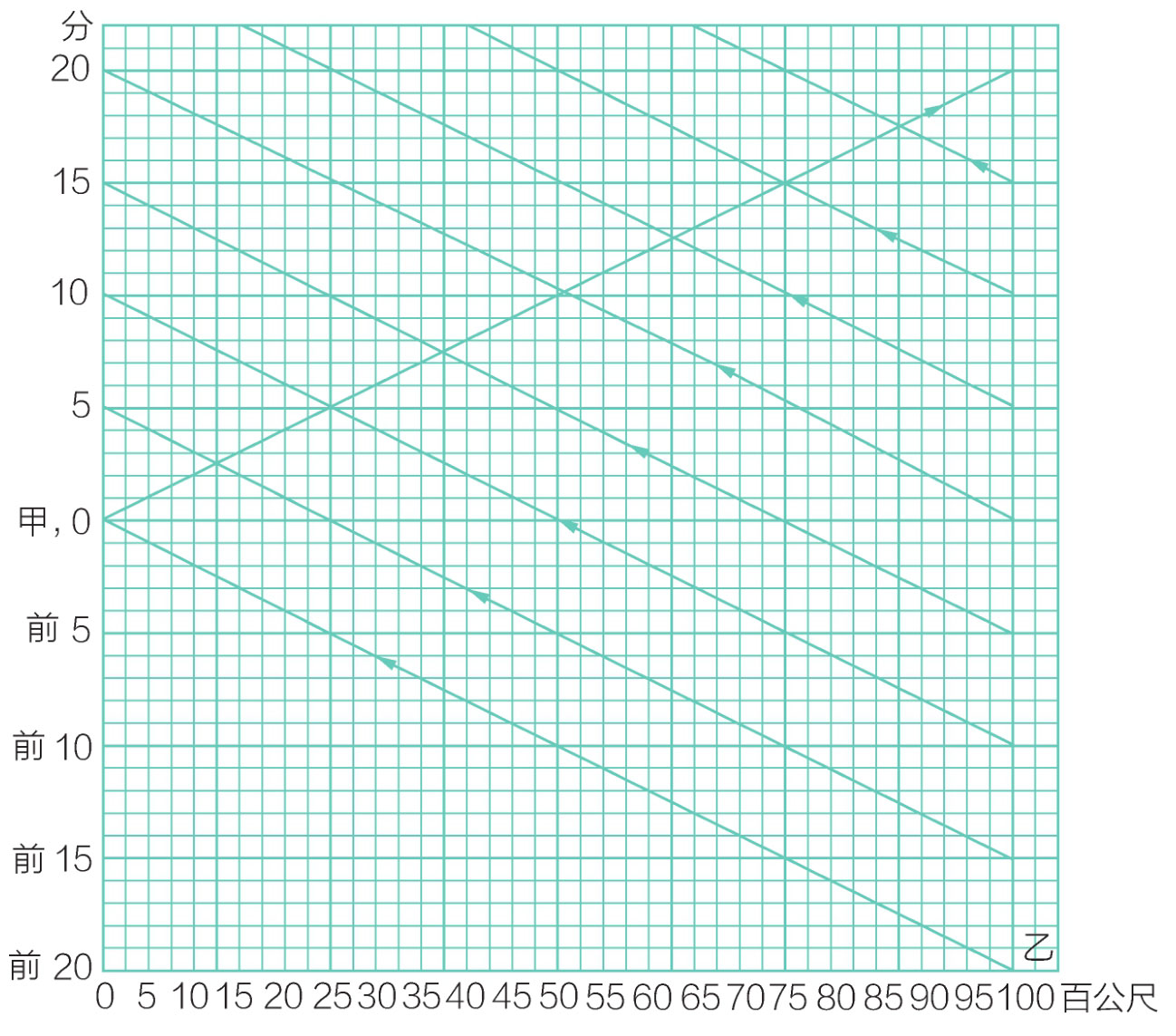 马先生说,这个题目的要点,在于正确地指明解法所在。他将表示甲和乙所走的行程、时间的关系的线画出以后(如图5-5所示),这样问: