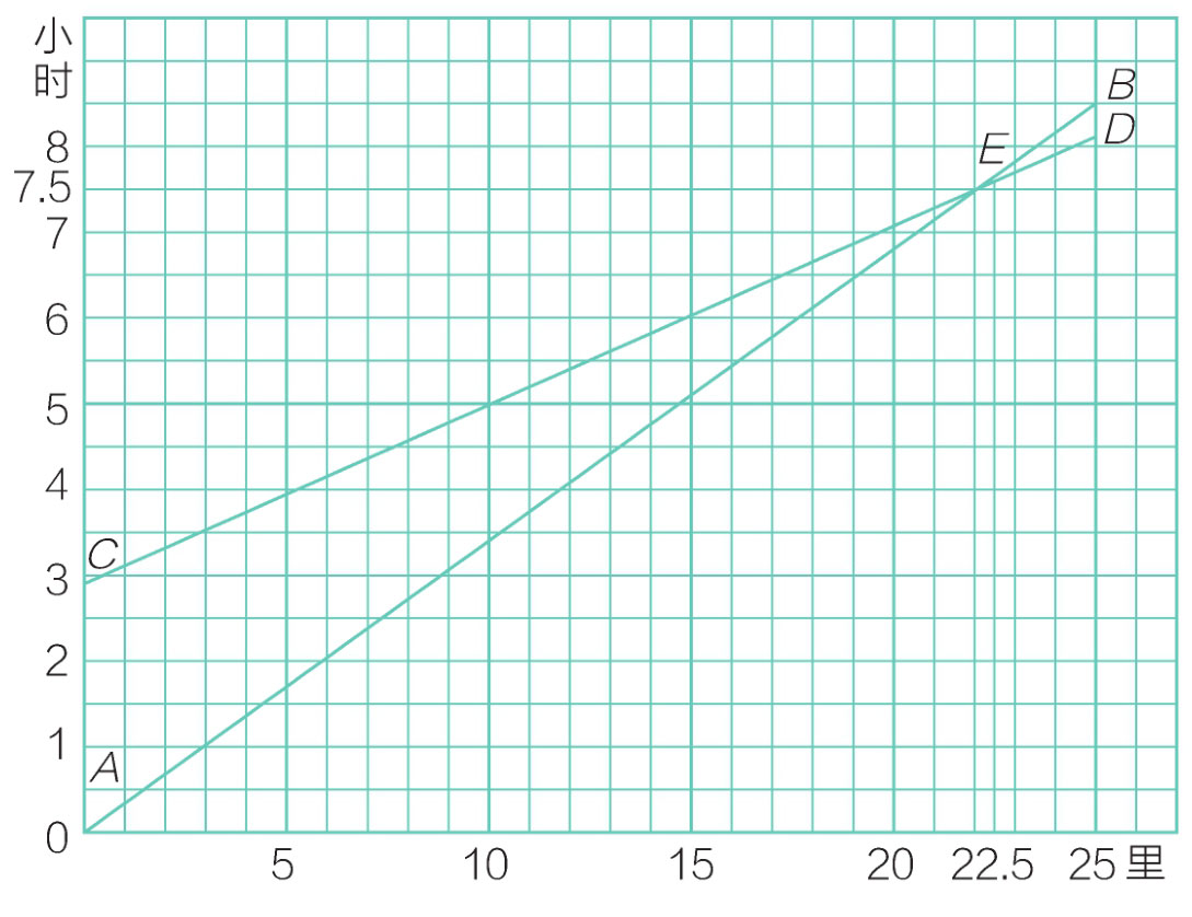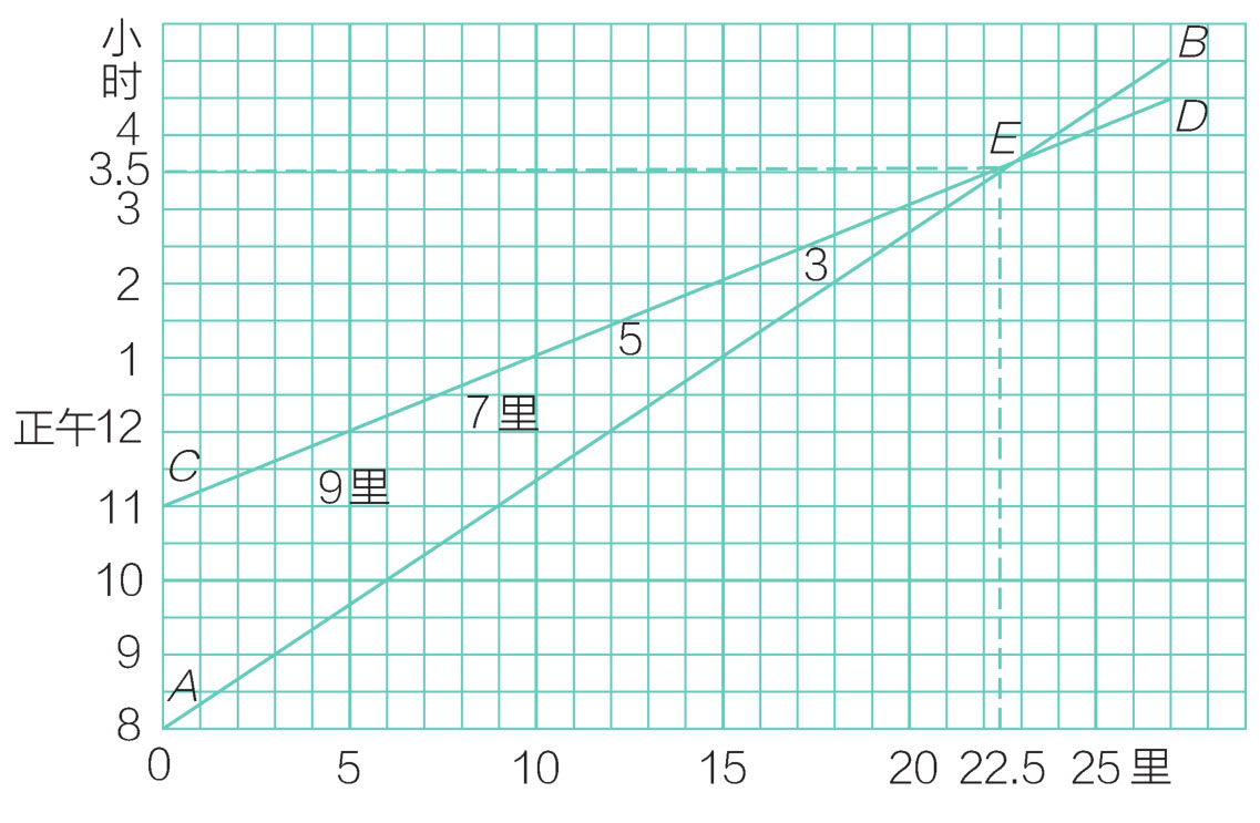 “从这次起,公式不写了,让你们去如法炮制吧。从图上还可以看出来,赵阿毛和赵小毛相遇的地方,距家22.5里。若是将 AE 、 CE 延长,两线间的距离又越来越长,但 AE 翻到了 CE 的上面。这就表示,若他们父子碰到以后,各自仍继续前进,赵小毛便走在了赵阿毛前面,并且二人越离越远。”