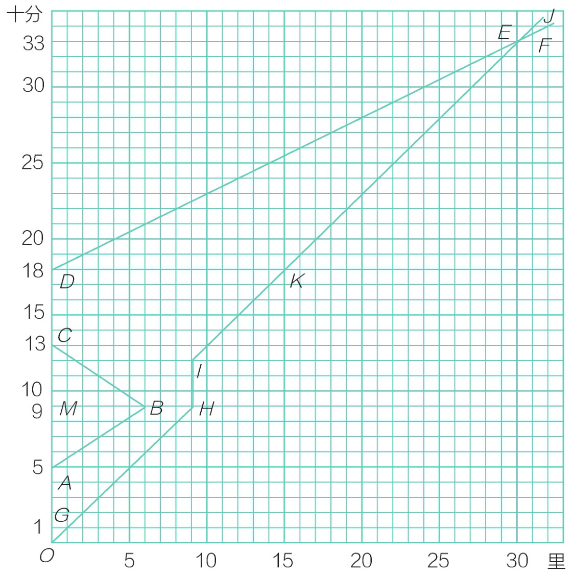 “至于表示甲所走的行程和时间的线,却比较简单,始终是一定的速度前进,只有在乙达到6里( B )——正是90分钟,甲达到9里时,他休息了(停着不动)30分钟,然后继续前进,因而这条线是 GH 、 IJ 。