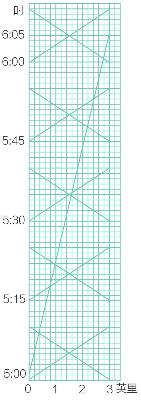 这题只需用第二节课的最后一个作基础便可解答出来。用横线表示路程,每一小段1里;用纵线表示时间,每两小段1小时。——纵横线用作单位1的长度,无妨各异,只要表示得明白,如图5-1所示。
