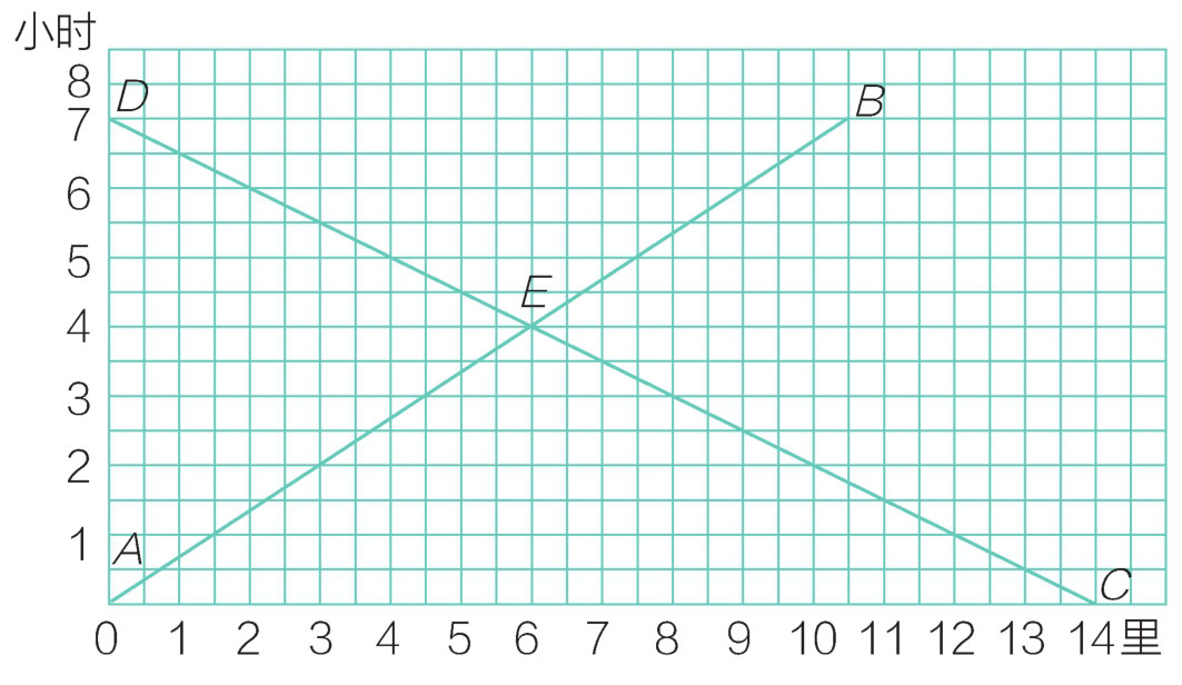这差不多算是我们自己做出来的,马先生只告诉我们应当注意两点:第一,甲和乙走的方向相反,所以甲从 C 向 D ,乙就从 A 向 B , AC 相隔14里;第二,因为题上所给的数都不大,图上的单位应取大一些——都用二小段当一——这样图才好看,做算学也需兼顾好看,如图5-4所示。