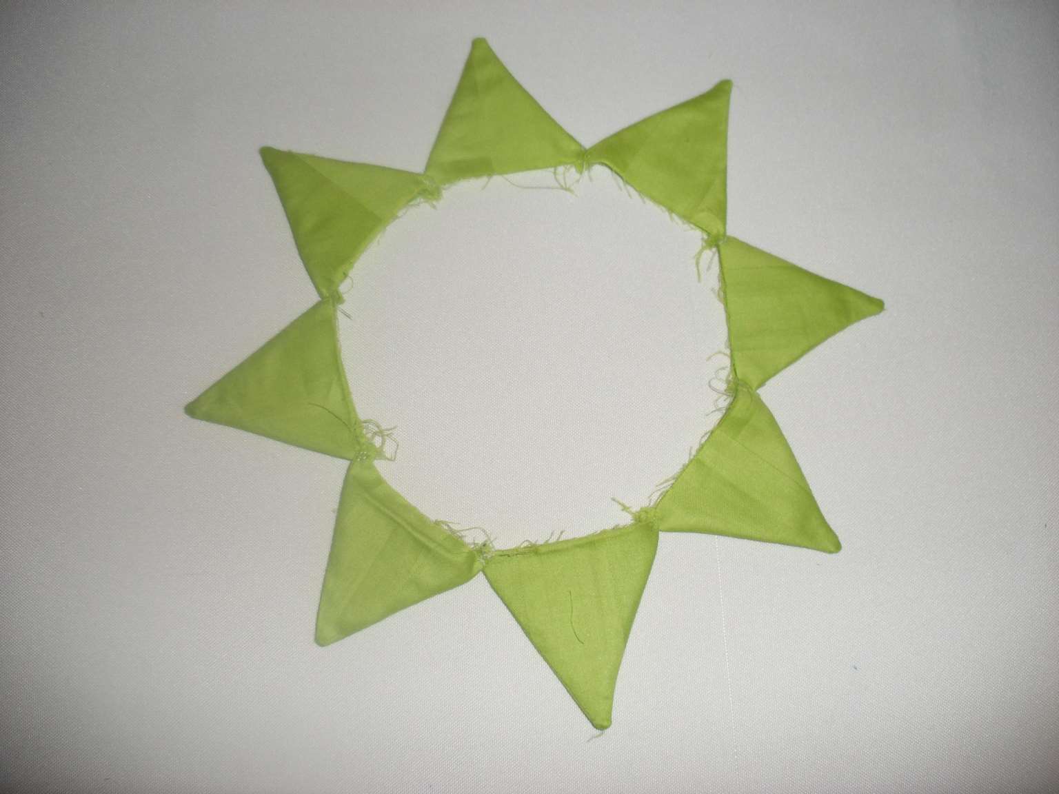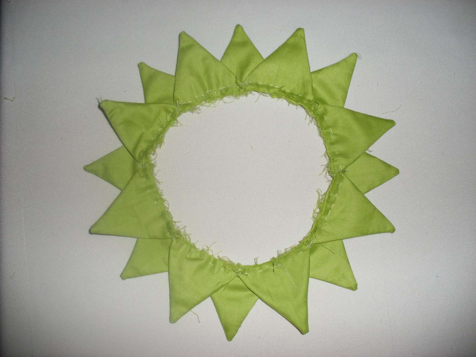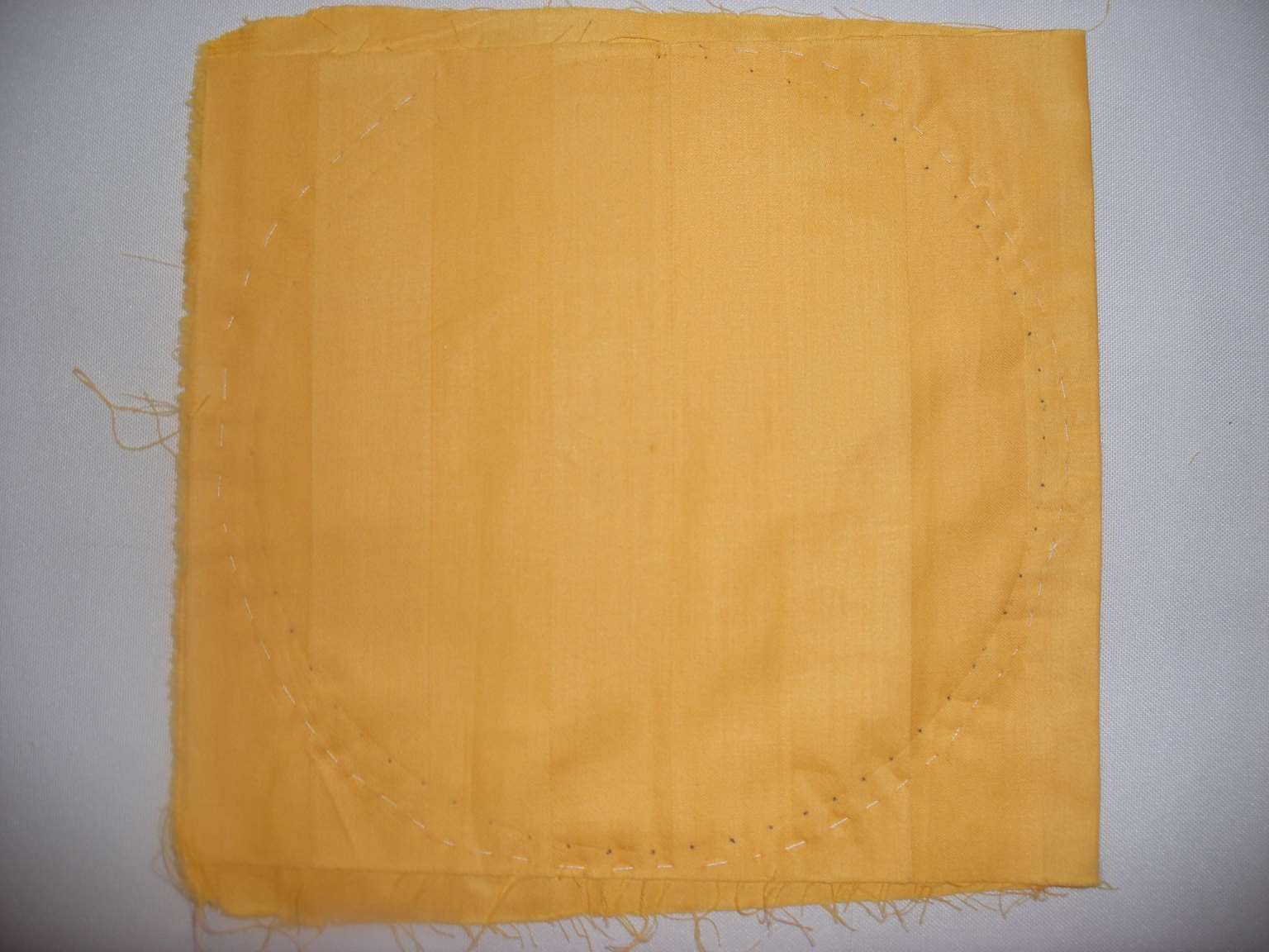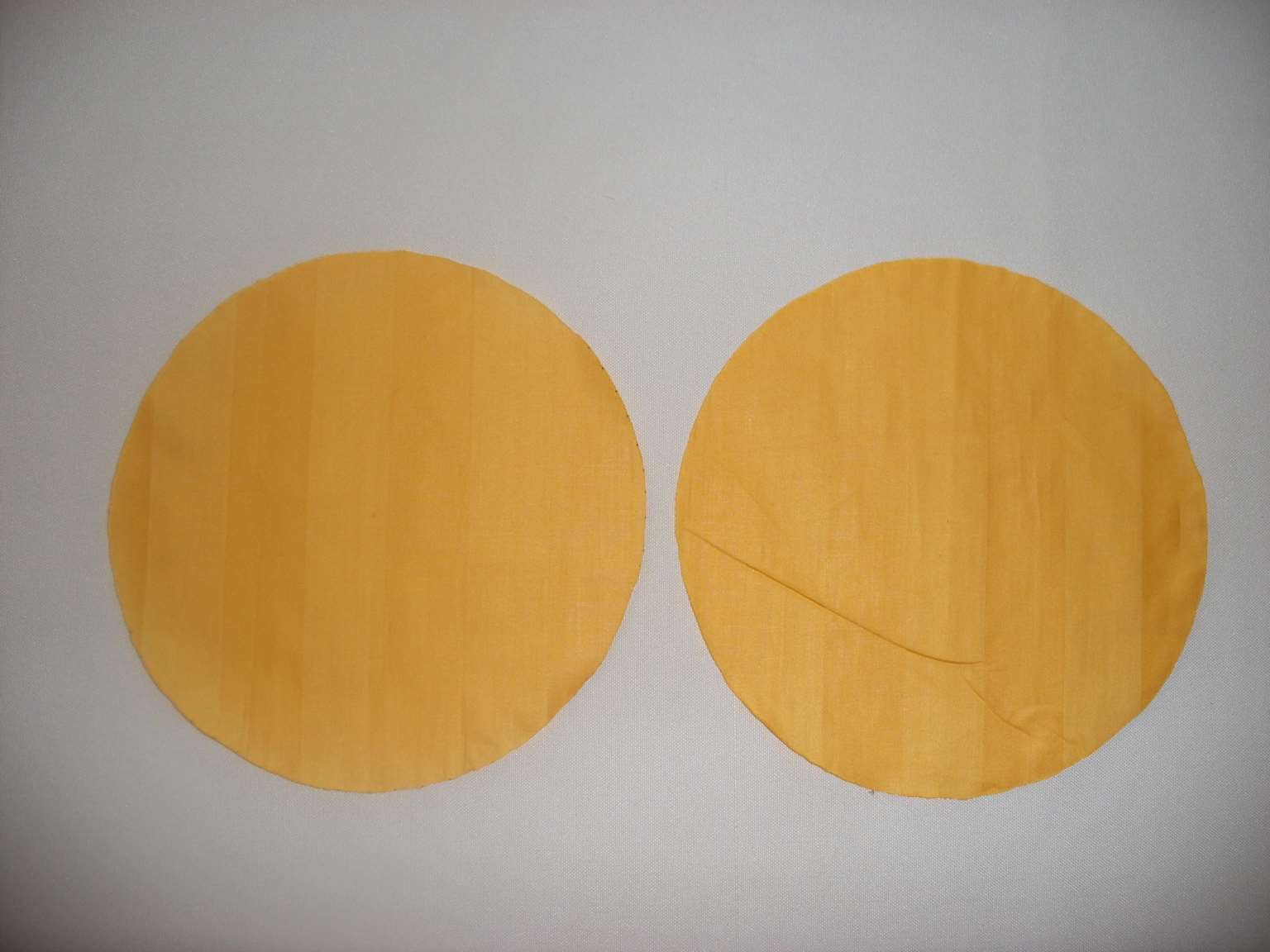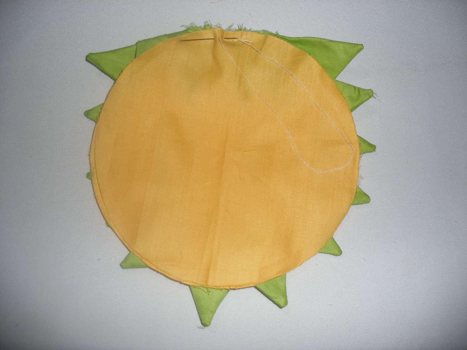 制作步骤:1.将黄布对折,用圆规在其上均匀地扎上一圈小孔,小孔外围用针线绷一圈,以便接下的剪裁,如图所示。