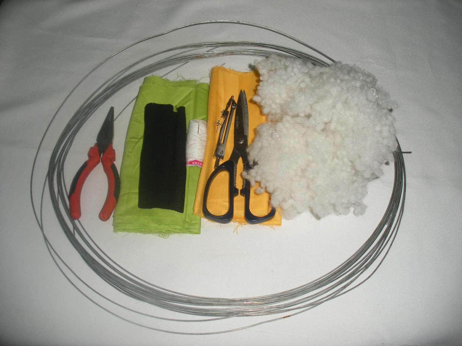 材料:绿色、黄色、黑色 3 块布,针线、剪刀,圆规,珍珠棉,中等型号的铁丝,钳子,如图所示。