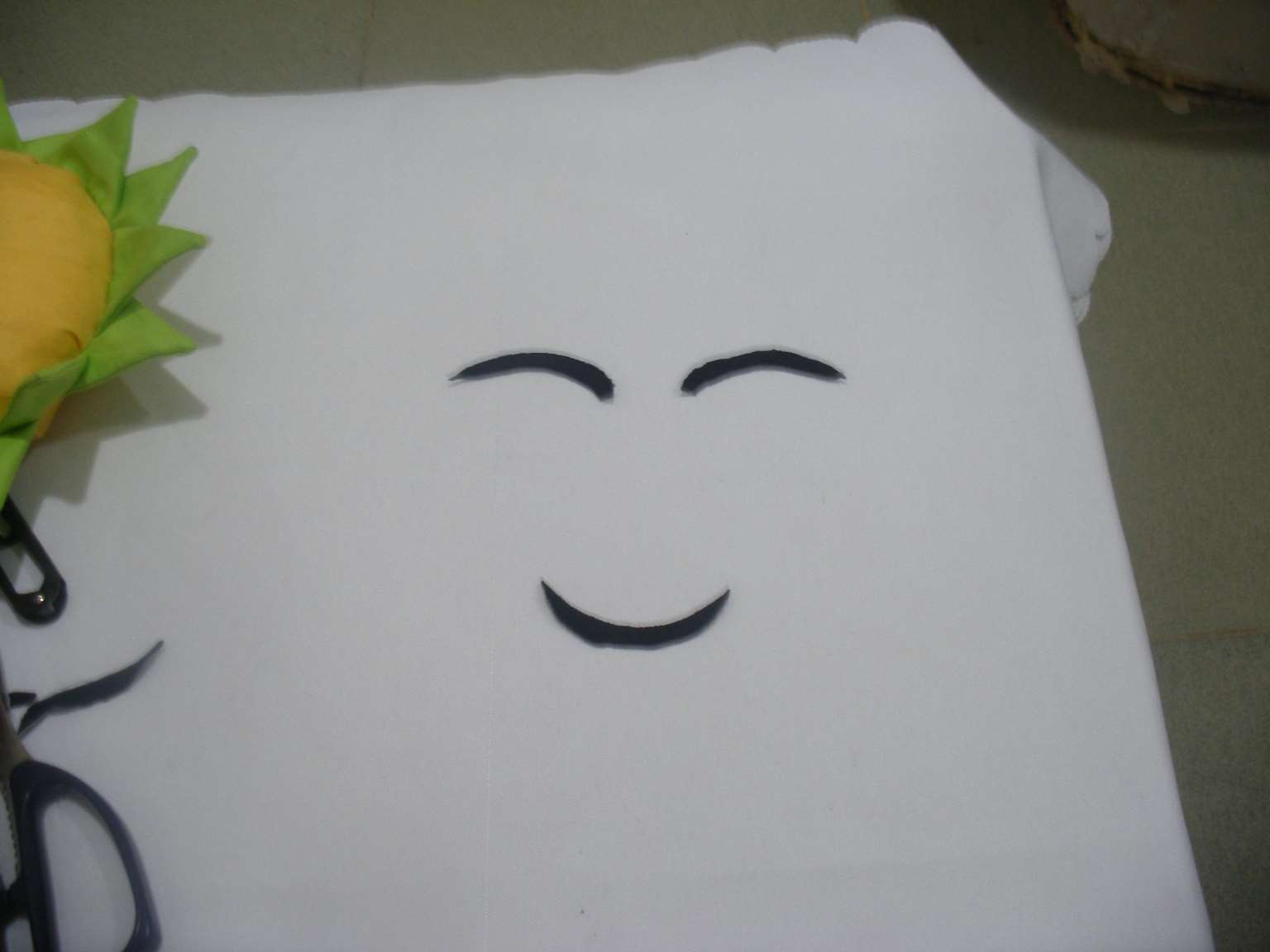 11.用黑布剪 2 条眉毛和一张嘴,如图所示。12.将眉毛和嘴缝在花芯上,如图所示。