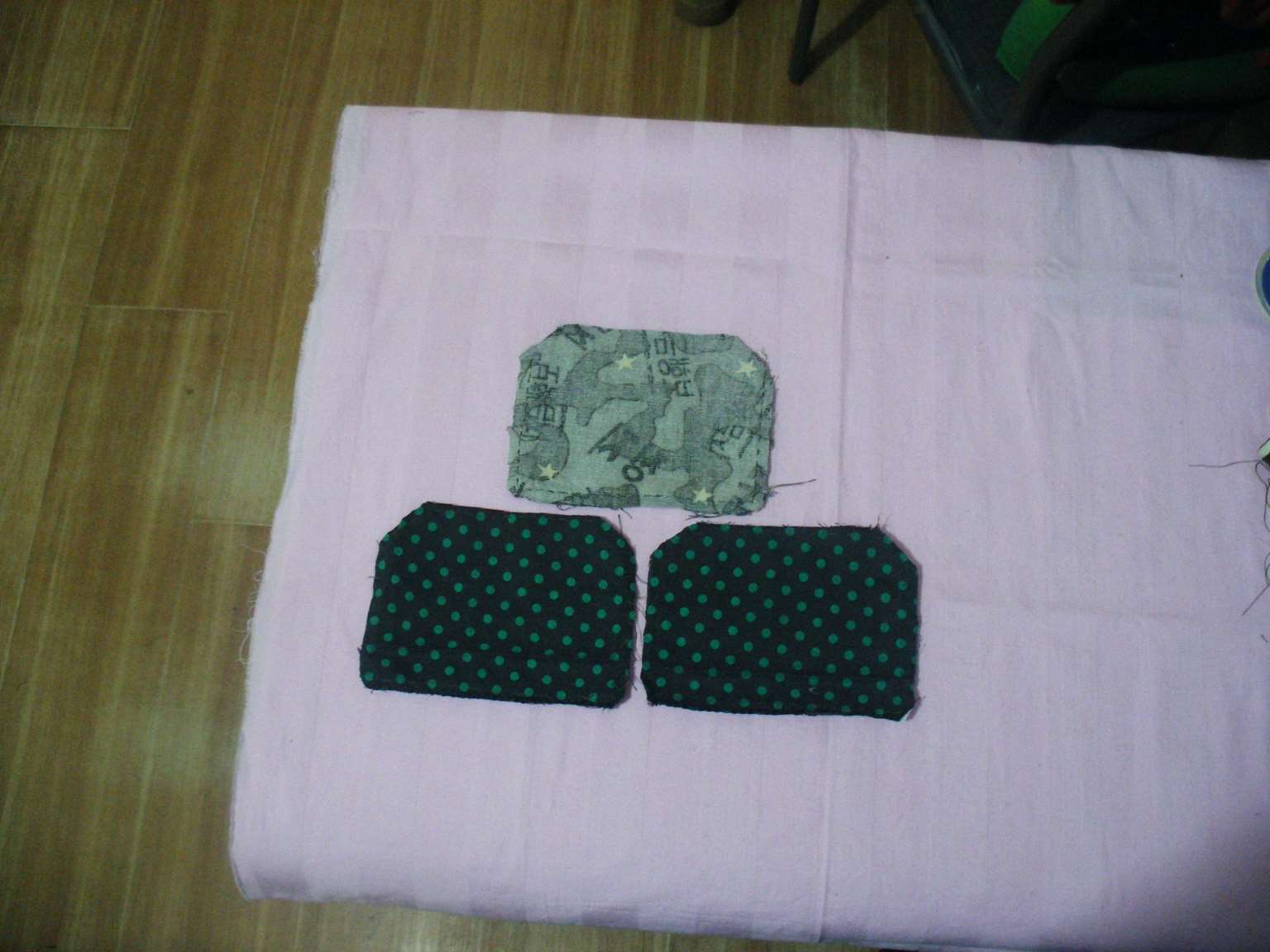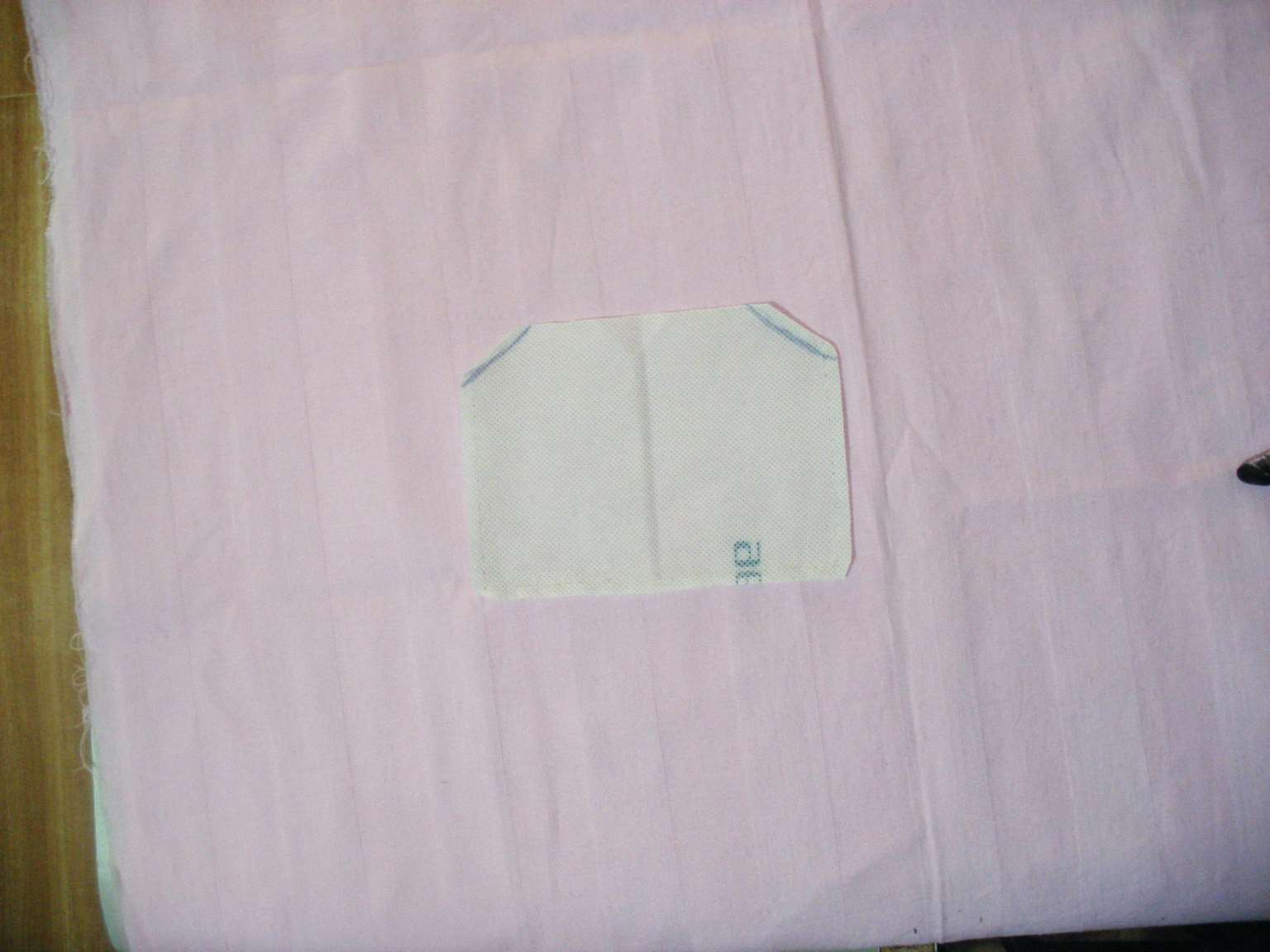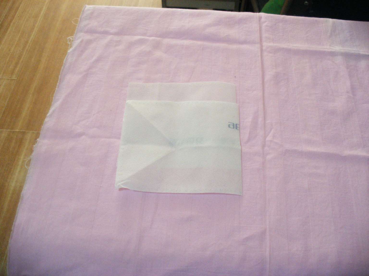 3.将一块不织布平铺在准备做为内衬的花布上,并用针(大头针)将二者别在一起,如图所示,以便剪裁。