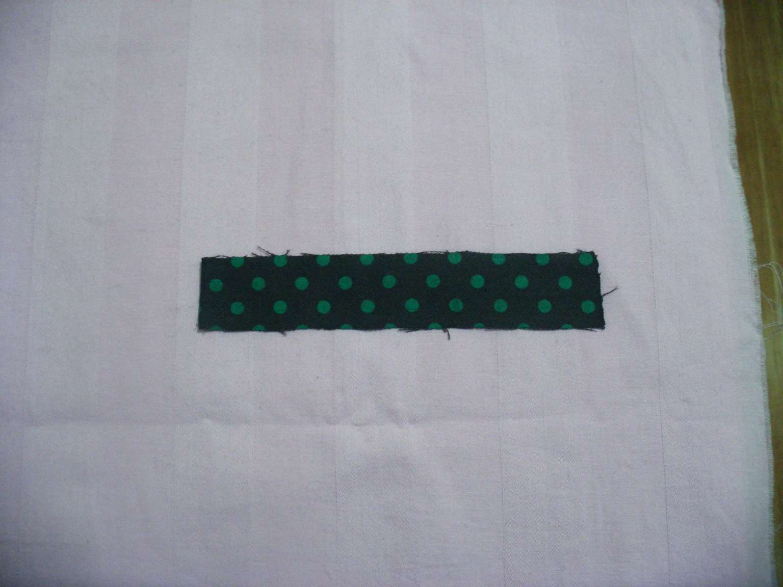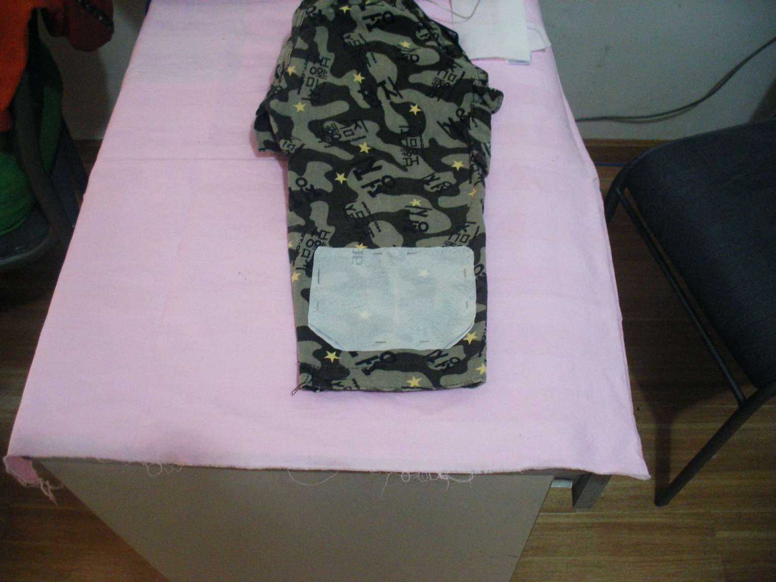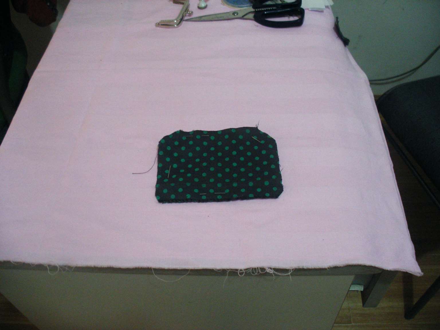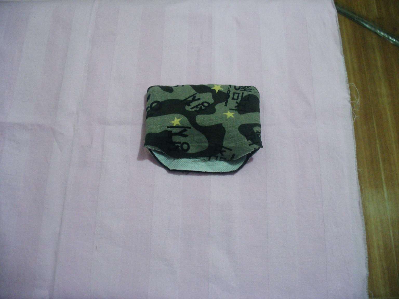 3.将一块不织布平铺在准备做为内衬的花布上,并用针(大头针)将二者别在一起,如图所示,以便剪裁。