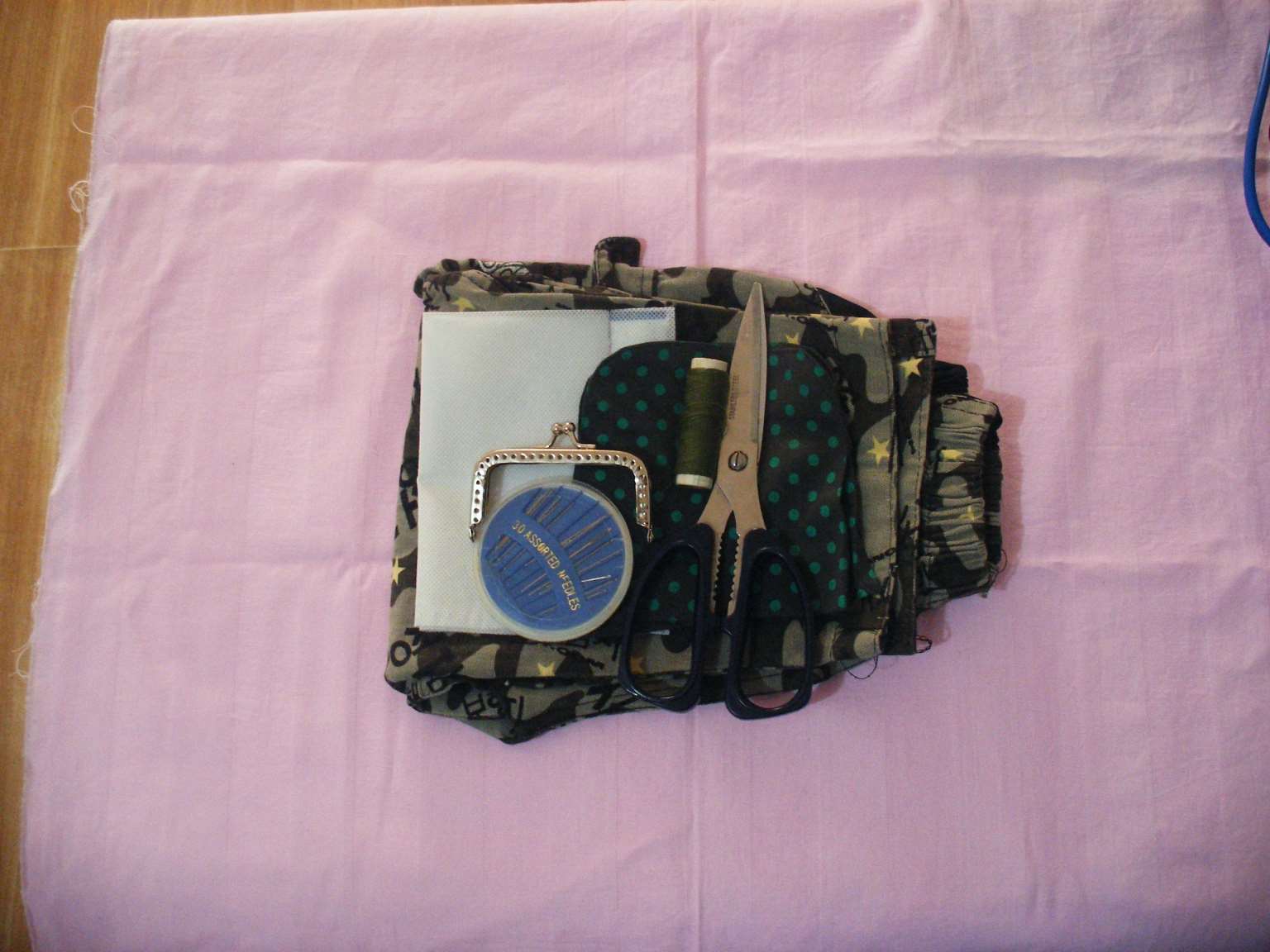 材料:不织布、花布、口金式铁夹、针线、剪刀,如图所示。