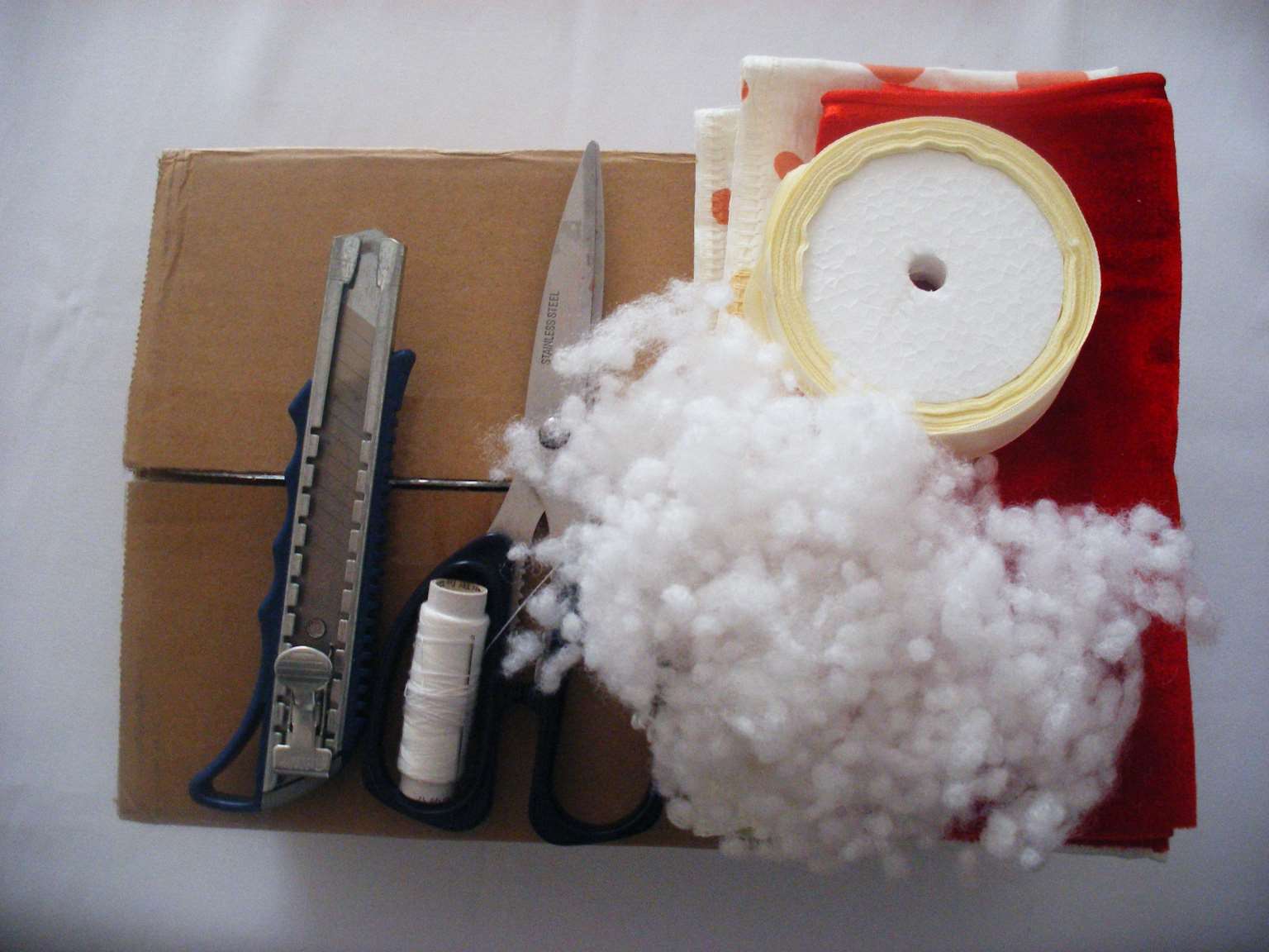 材料:剪刀、割纸刀、珍珠棉、针线、纸板、花布、绒布、缎带、乳胶、刷子,如图所示。