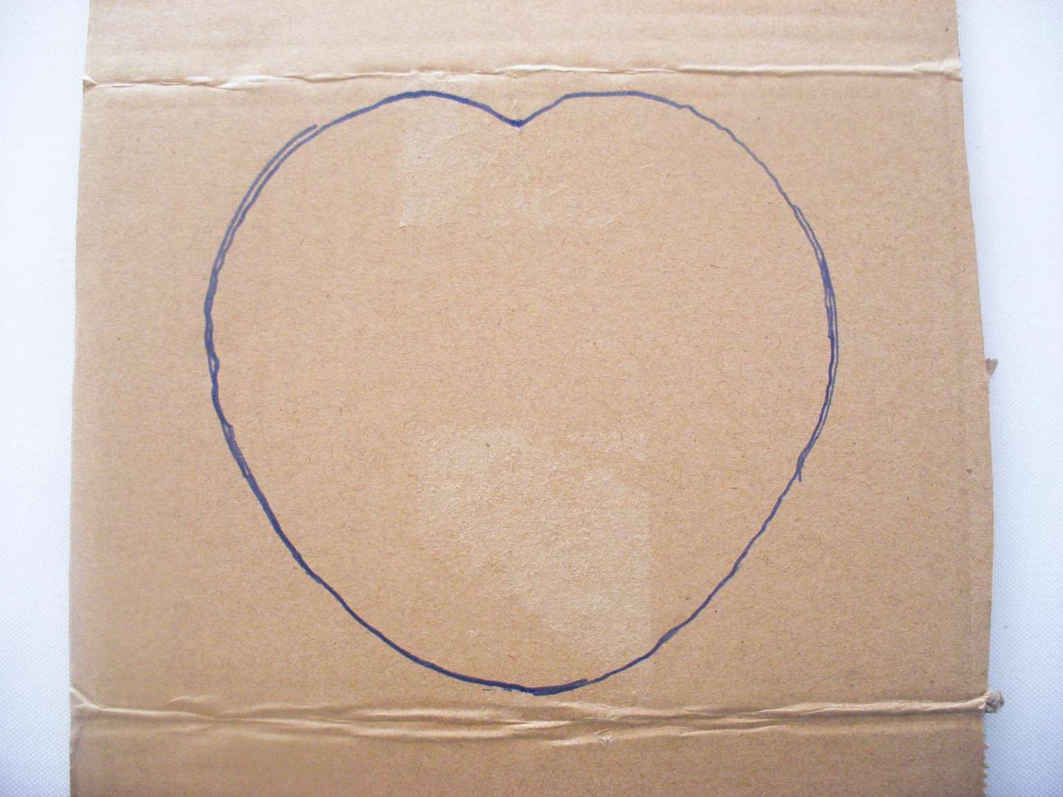制作步骤:1.在纸板上画个桃心,如图所示。2.用割纸刀将桃心刻下,如图所示。