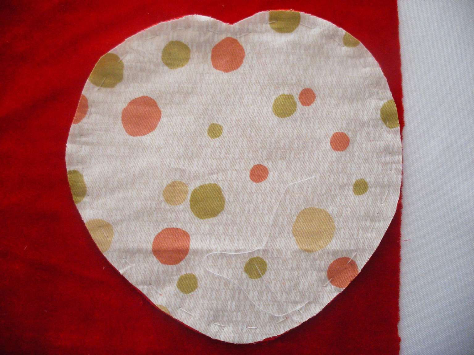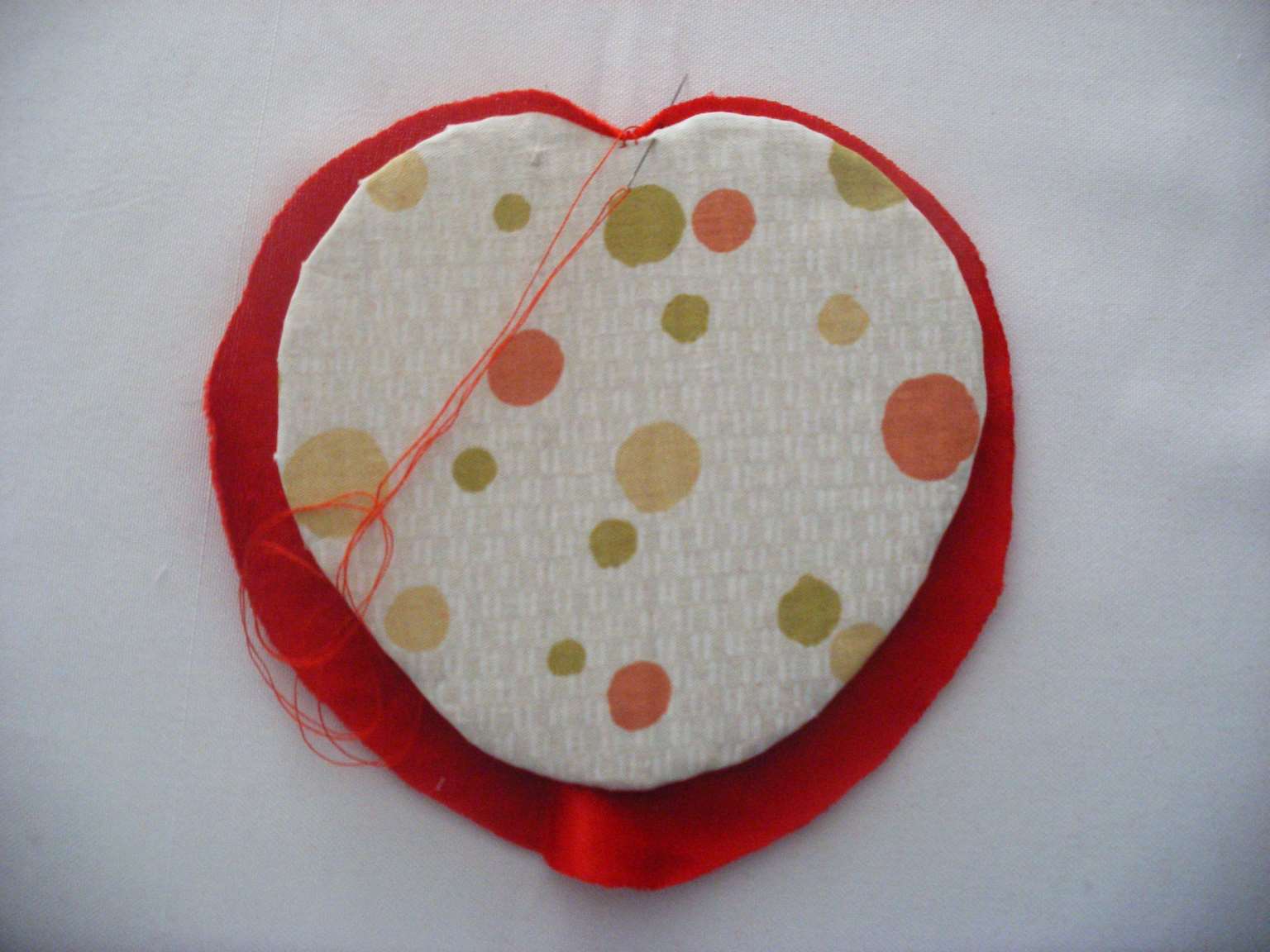 16.用针线将大桃心绒布与花布、纸板缝合在一起,如图所示。记得预留一段长约 5 厘米的开口。